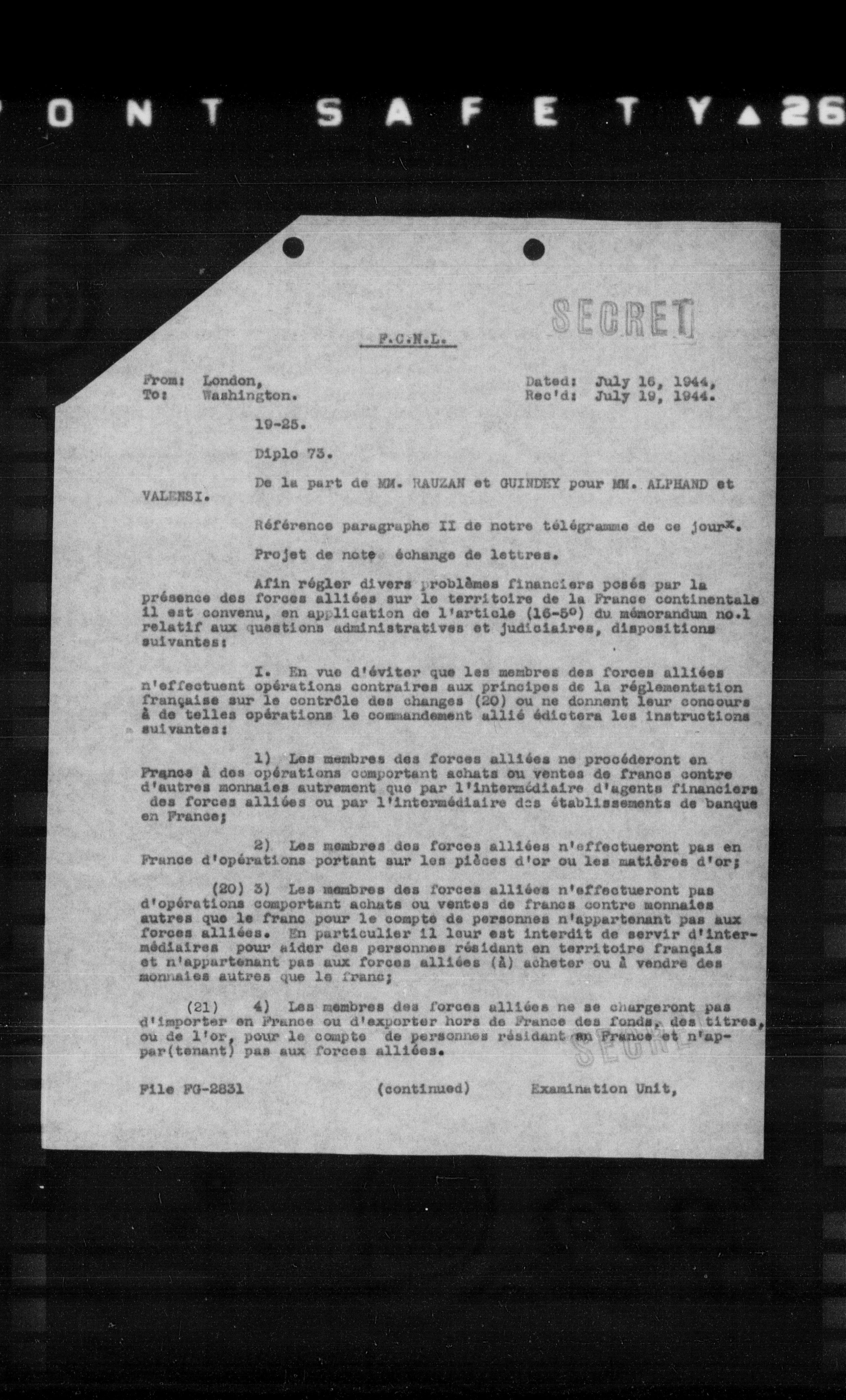 (21) 4) Les membres des forces alliées ne se chargeront pas d'importer en France ou d'exporter hors de France des fonds, des titres ou de l'or, pour le compte de personnes résidant en France et n'appar (tenant) pas aux forces alliées.