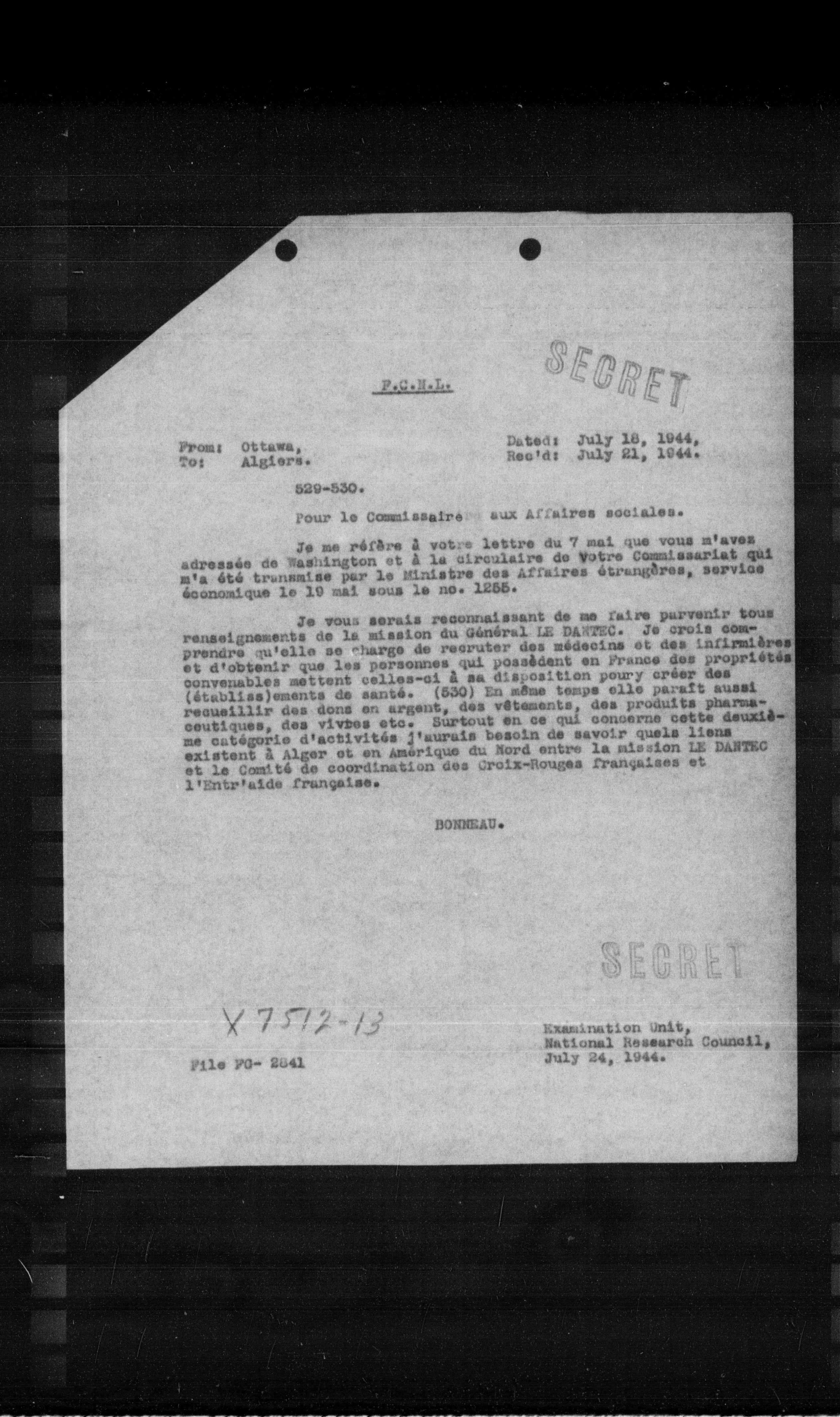 Je vous serais reconnaissant de me faire parvenir tous renseignements de la mission du Général LE DANTEC. Je crois comprendre qu'elle se charge de recruter des médecins et des infirmières et d'obtenir que les personnes qui possèdent en France des propriétés convenables mettent celles-ci à sa disposition pour créer des (établissements de santé. (530) En même temps elle paraît aussi recueillir des dons en argent, des vêtements, des produits pharmaceutiques, des vivres etc. Surtout en ce qui concerne cette deuxième catégorie d'activités j'aurais besoin de savoir quels liens existent à Alger et en Amérique du Nord entre la mission LE DANTEC et le Comité de coordination des Croix-Rouge françaises et l'Entr'aide française.
