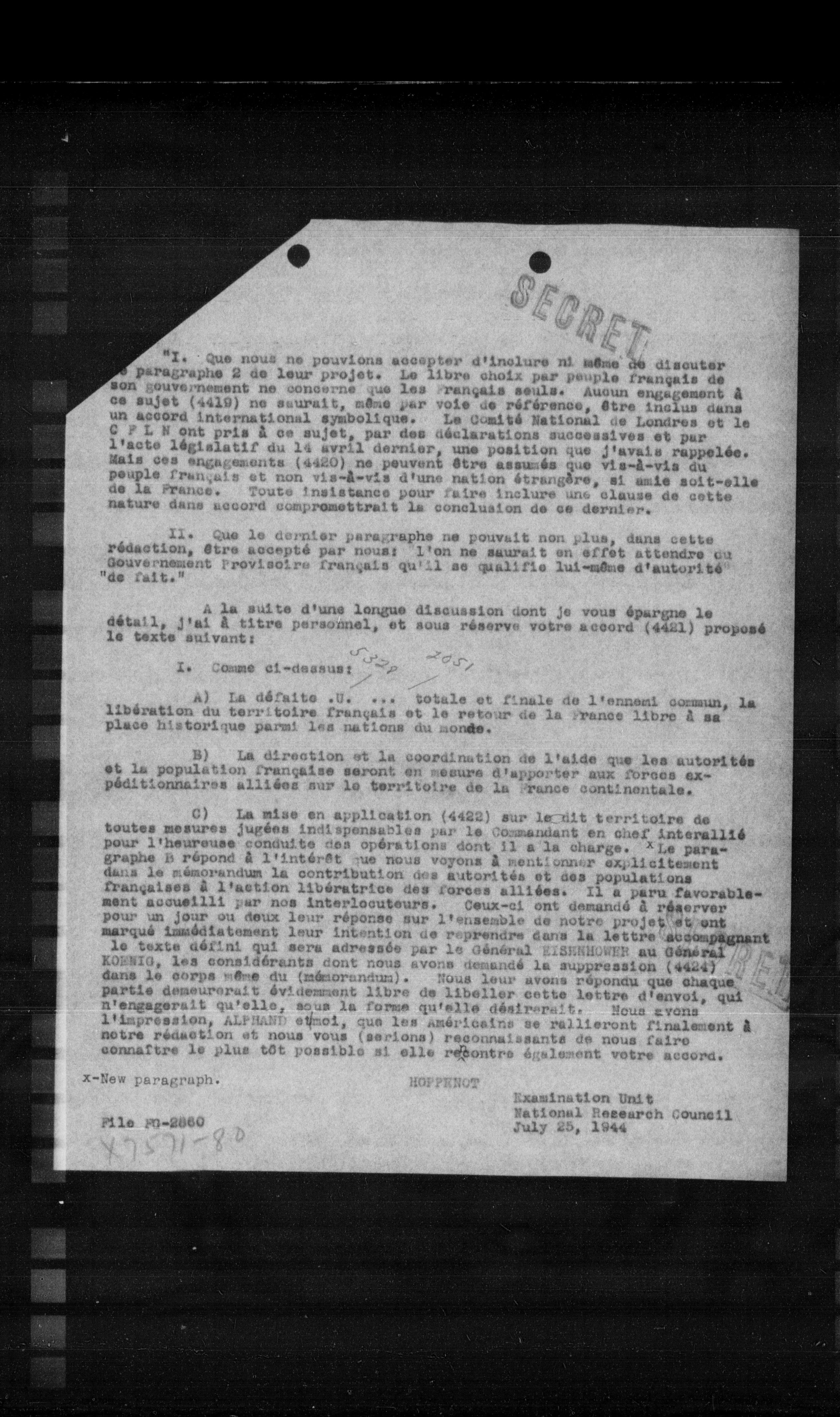 "1. Que nous ne pouvions accepter d'inclure ni même de discuter paragraphe 2 de leur projet. Le libre choix par peuple français de son gouvernement ne concerne que les Français seuls. Aucun engagement à ce sujet (4418) ne saurait, même par voie de référence, être inclus dans un accord international symbolique. Le Comité National de Londres et le C F L N ont pris à ce sujet, par des déclarations successives et par l'acte législatif du 14 avril dernier, une position que j'avais rappelée. Mais ces engagements (4420) ne peuvent être assumés que vis-à-vis du peuple français et non vis-à-vis d'une nation étrangère, si cela soit-elle de la France. Toute insistance pour faire inclure une clause de cette nature dans un accord compromettrait la conclusion de ce dernier.
