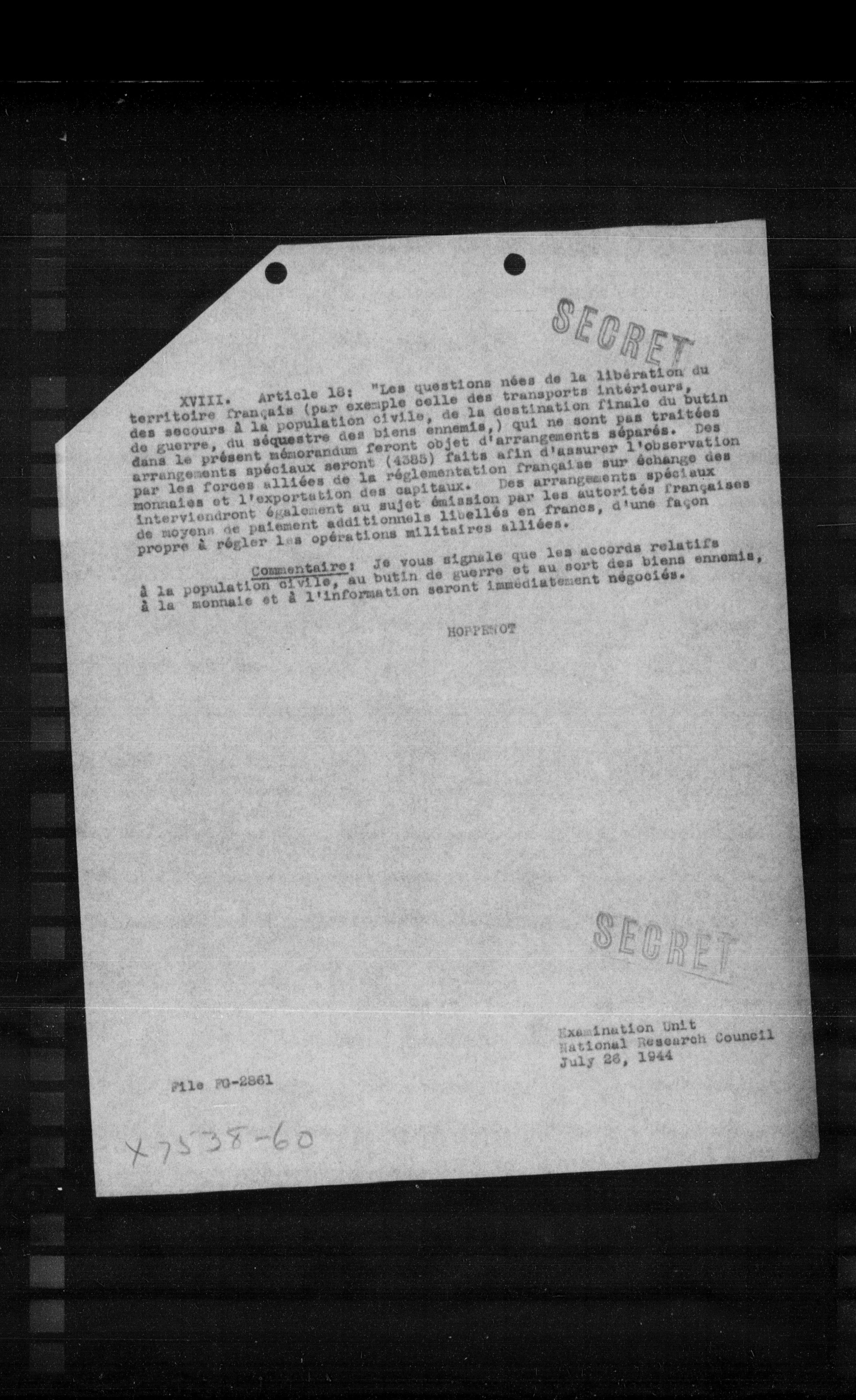 XVIII. Article 18: "Les questions nées de la libération du territoire français (par exemple celle des transports interieure, des secours a la population civile, de la destination finale du butin de guerre, du séquestre des biens ennemis, qui ne sont pas traitées dans le présent némorandum feront objet d'arrangements séparés. Des arrangements spéciaux seront (4388) faits afin d'assurer l'observation par les forces alliées de la réglementation française sur échange des monnaies et l'exportation des capitaux. Des arrangements spéciaux intervienaront également au sujet émission par les autorités françaises de moyens de paiement additionnels libellés en francs, d'une façon propre à régler les opérations militaires alliées.