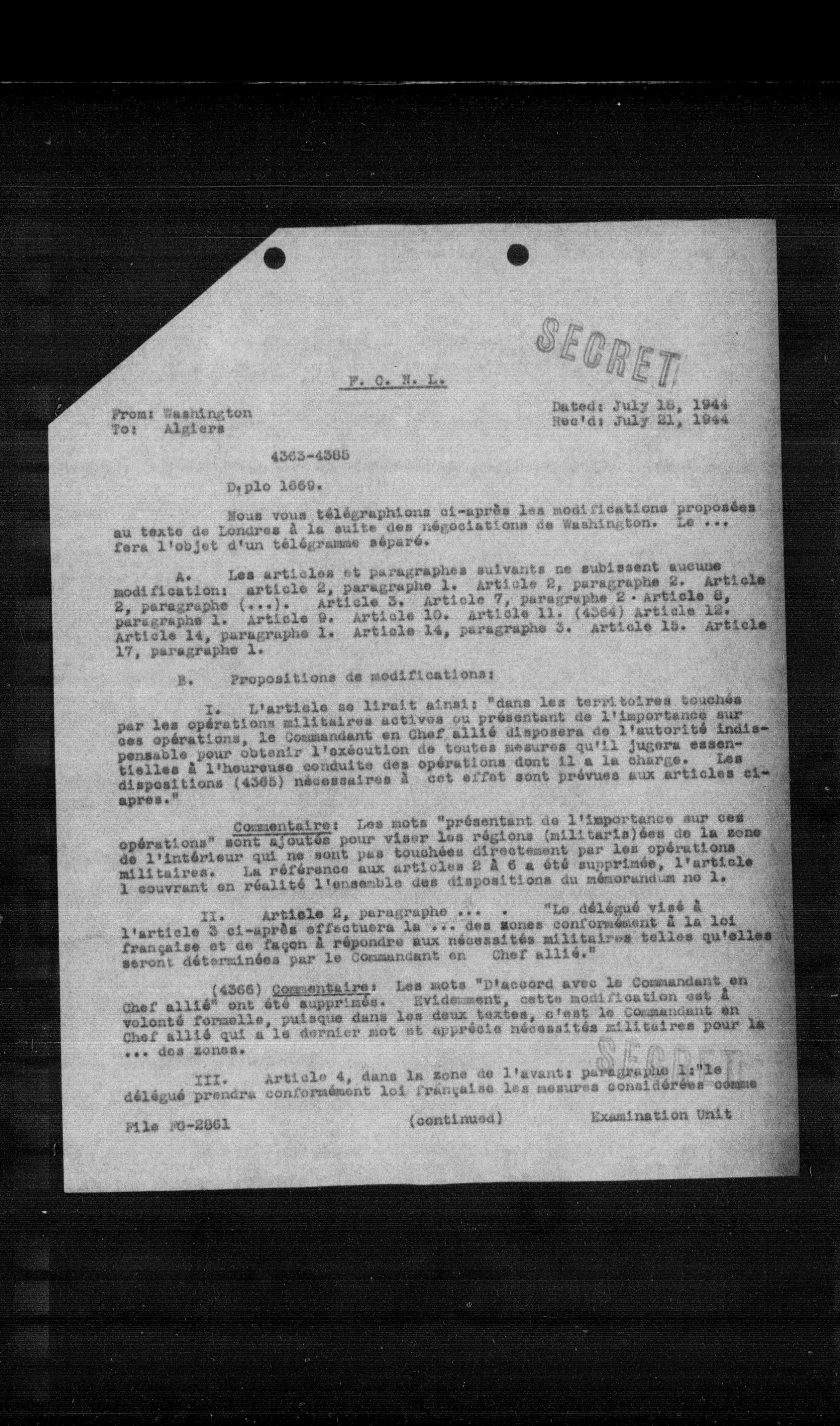 "dans les territoires touchés par les opérations militaires actives ou présentant de l'importance sur ces opérations, le Commandant en Chef allié disposera de l'autorité indispensable pour obtenir l'exécution de toutes mesures qu'il jugera essentielles à l'heureuse conduite des opérations dont il a la charge. Les dispositions (4365) nécessaires à cet effet sont prévues aux articles ci-après."