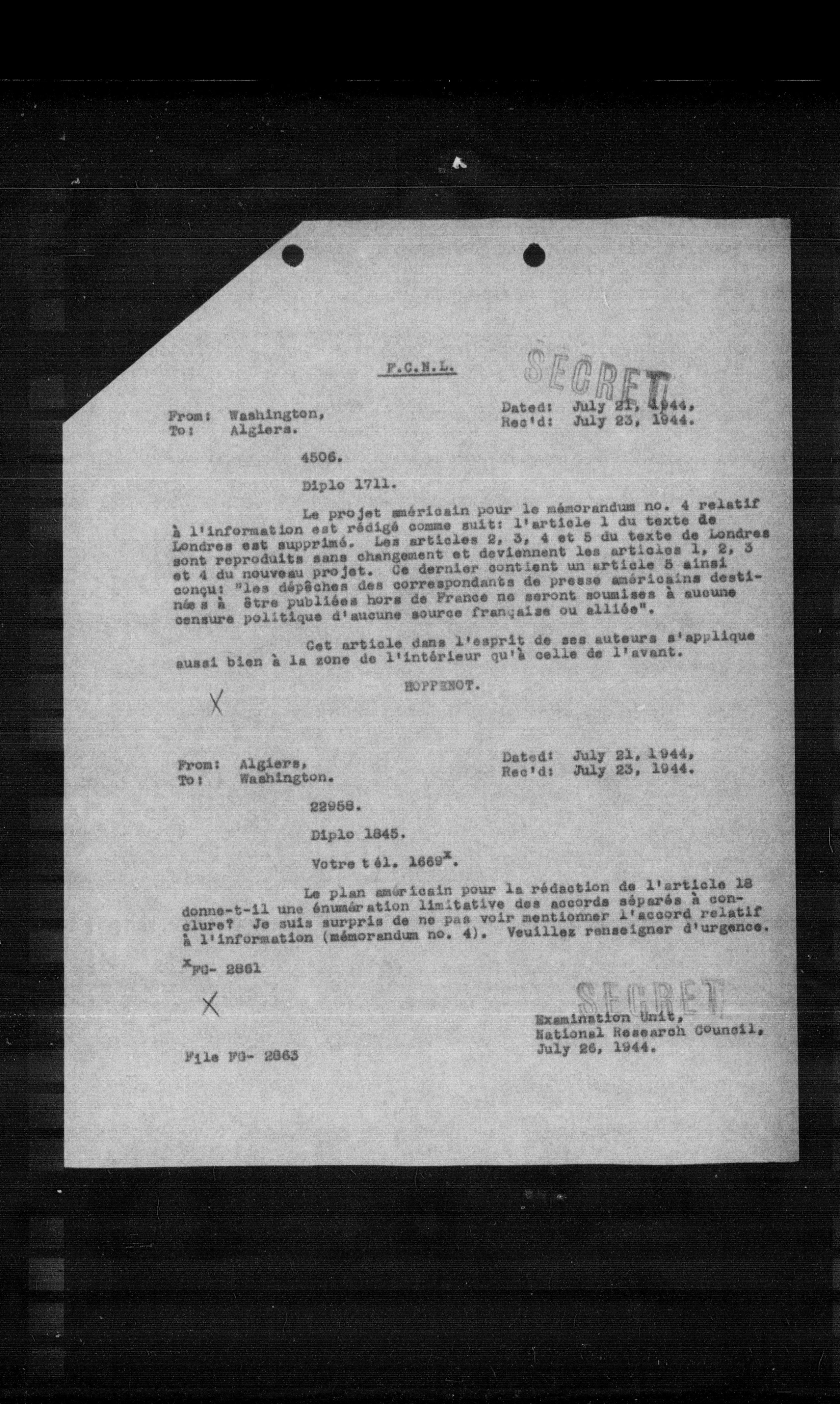 **Examinations Unit, National Research Council, July 26, 1944.**