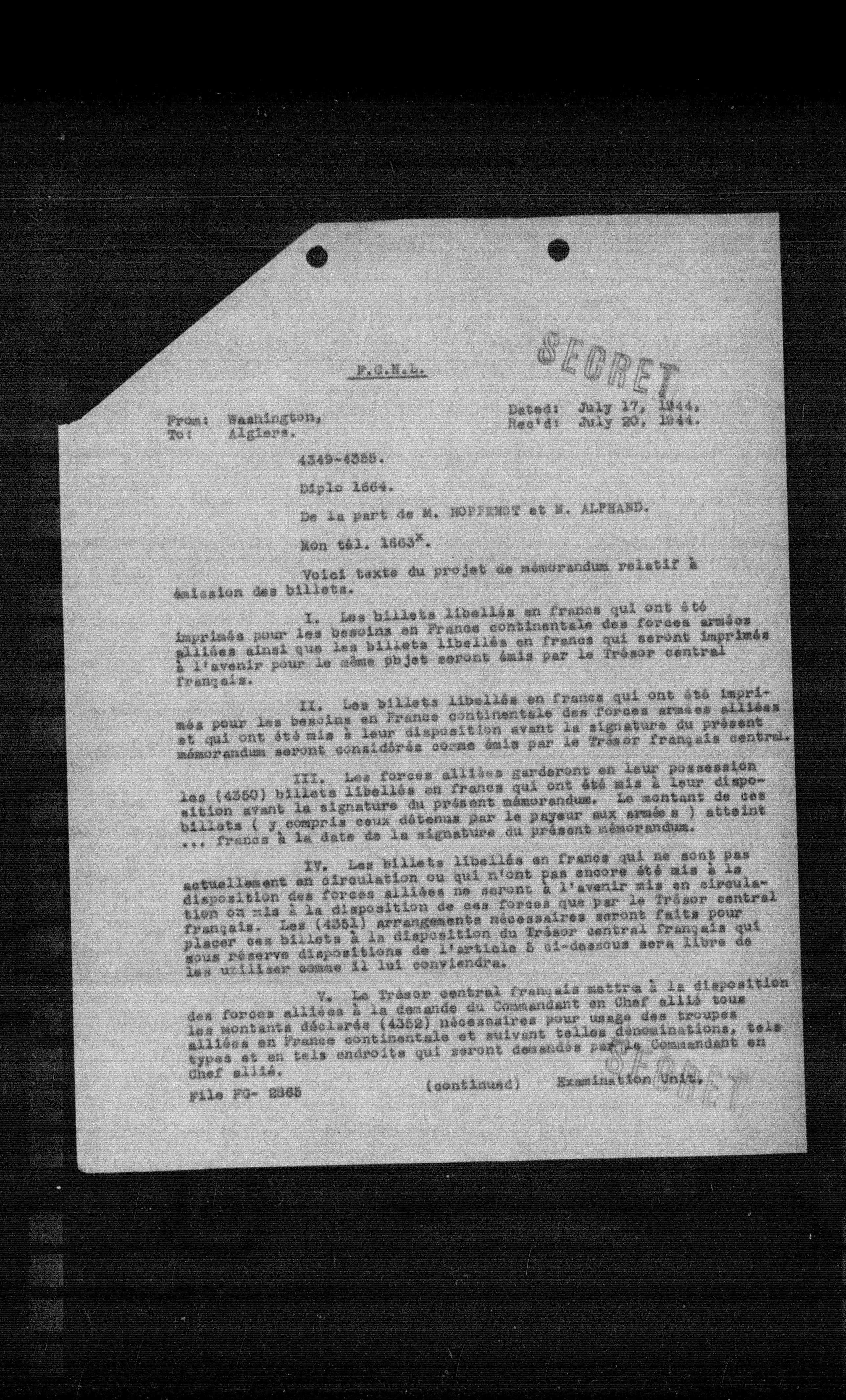 V. Le Trésor central français mettra à la disposition des forces alliées à la demande du Commandant en Chef allié tous les montants déclarés (4352) nécessaires pour usage des troupes alliées en France continentale et suivant telles dénominations, tels types et en tels endroits qui seront demandés par le Commandant en Chef allié.