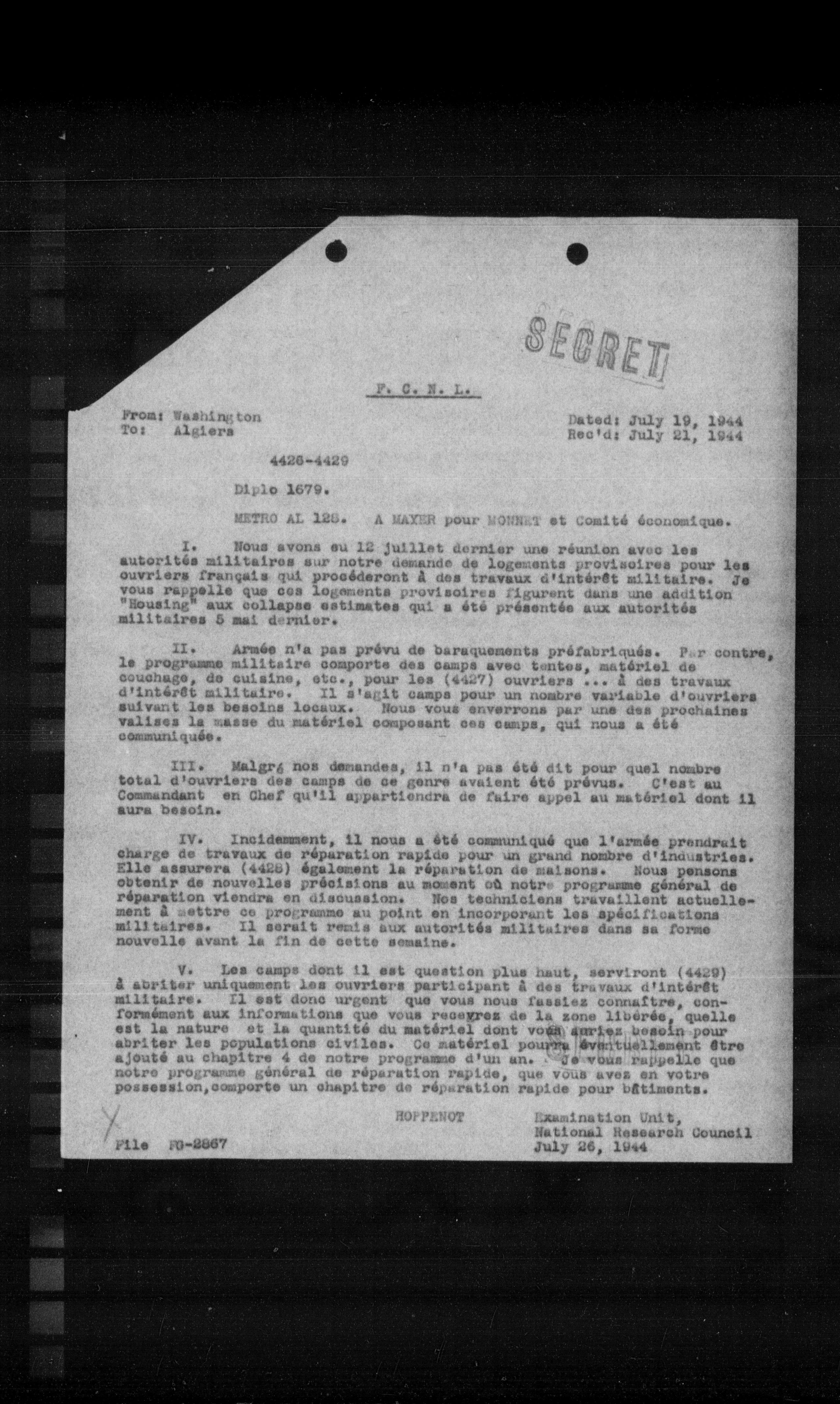 I. Nous avons eu 12 juillet dernier une réunion avec les autorités militaires sur notre demande de logements provisoires pour les ouvriers français qui procéderont à des travaux d'intérêt militaire. Je vous rappelle que ces logements provisoires figurent dans une addition "Housing" aux collages estimées qui a été présentée aux autorités militaires 5 mai dernier.
