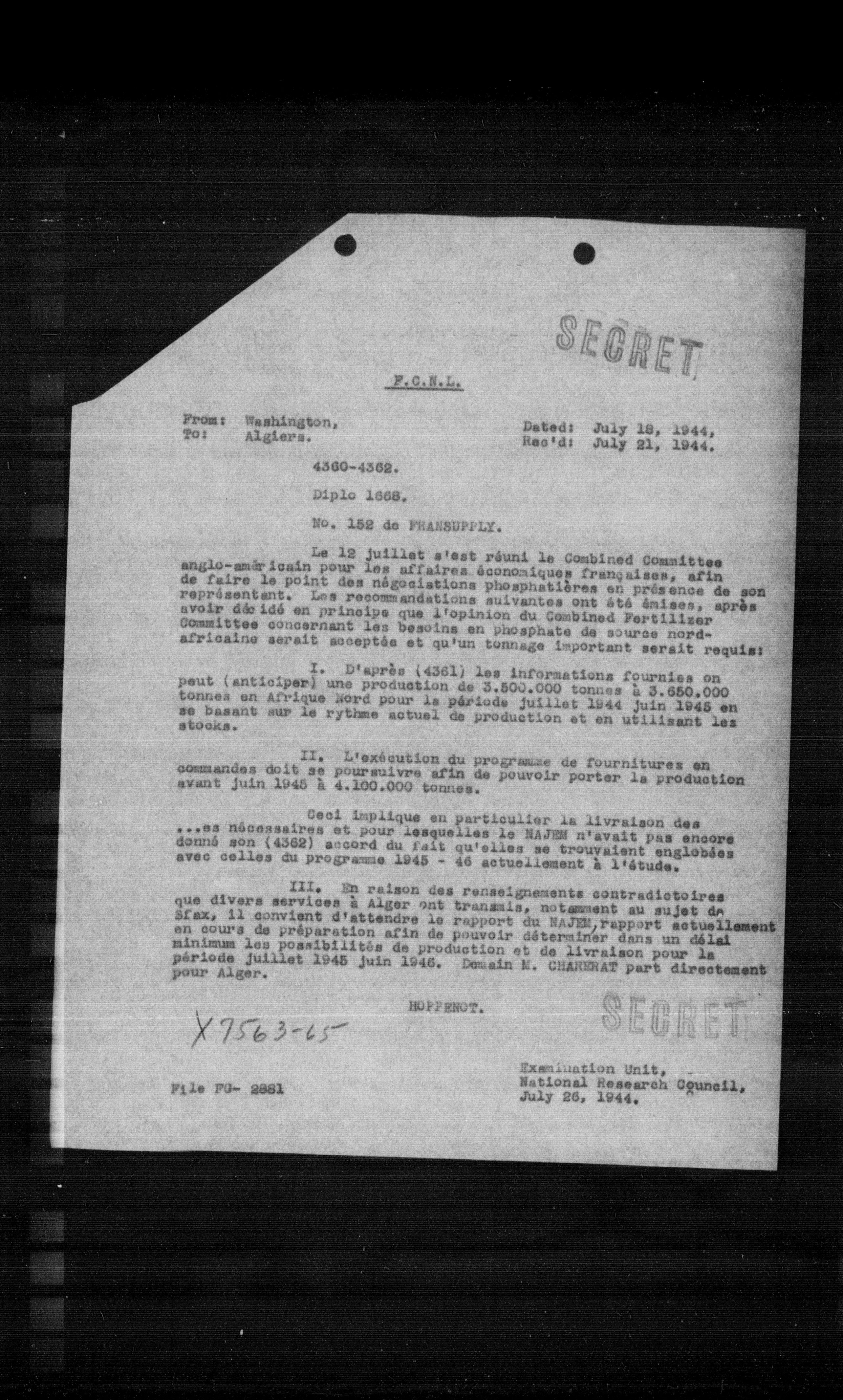 Le 12 juillet s'est réuni le Combined Committee anglo-américain pour les affaires économiques françaises, afin de faire le point des négociations phosphatisées en présence de son représentant. Les recommandations suivantes ont été émises, après avoir décidé en principe que l'opinion du Combined Fertilizer Committee concernant les besoins en phosphate de source nord-africaine serait acceptée et qu'un tonnage important serait requis: