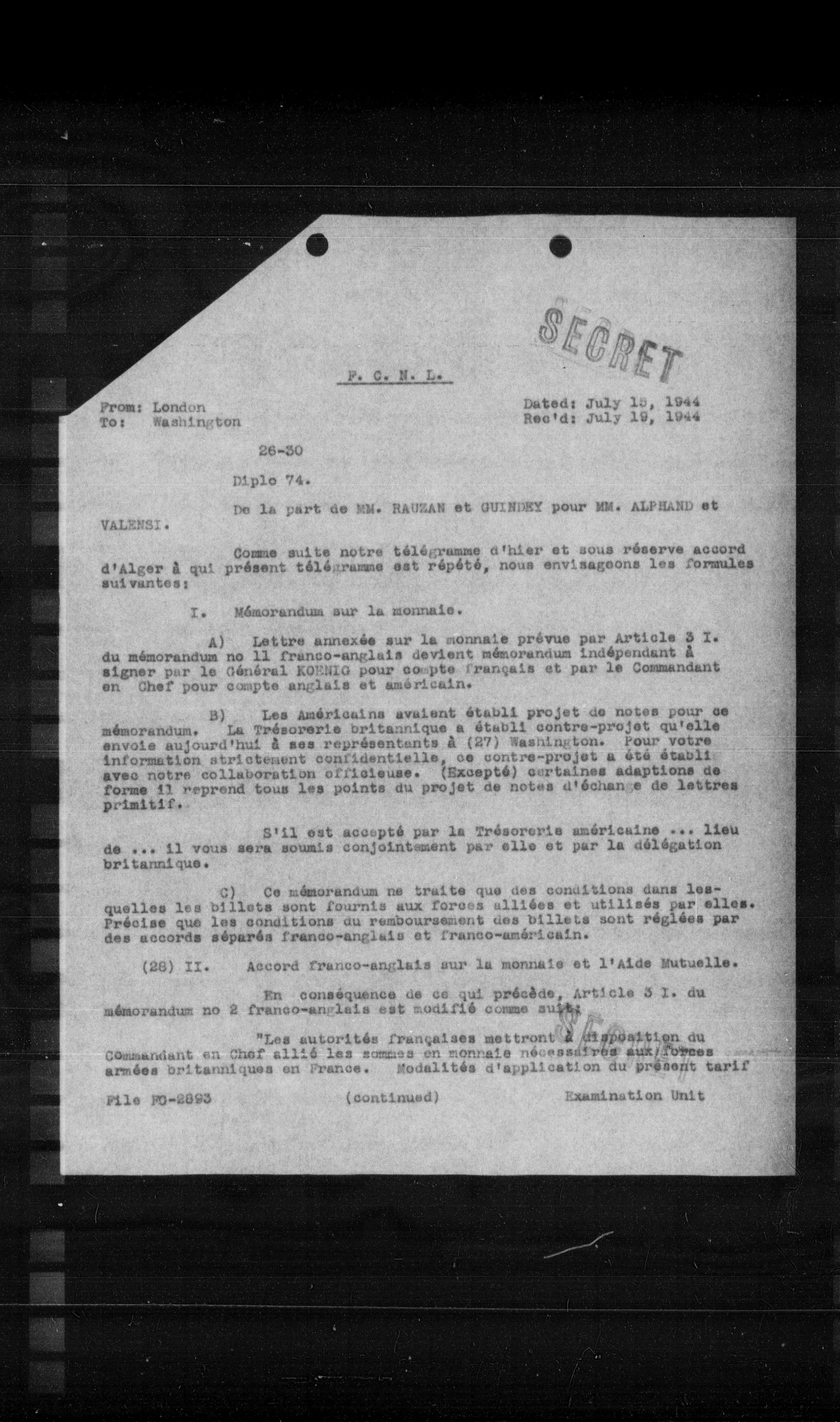 A) Lettre annexée sur la monnaie prévue par Article 3 I. du mémorandum no 11 franco-anglais devient mémorandum indépendant à signer par le Général KUENIG pour compte français et par le Commandant en Chef pour compte anglais et américain.