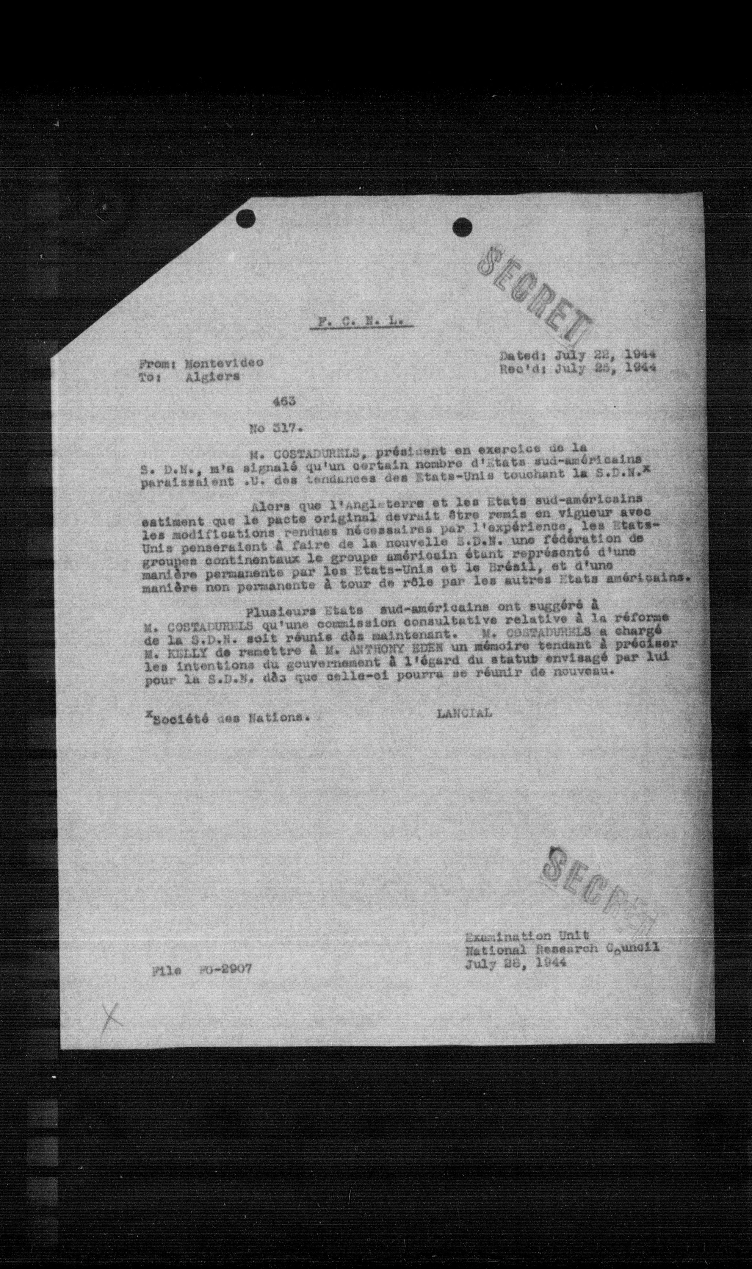 Plusieurs Etats sud-américains ont suggéré a M. COSTADURELS qu'une commission consultative relative a la réforme de la S.D.N. soit réunis dâs maintenant. M. COSTADURELS a chargé M. KELLY de remettre a M. ANTHONY HORN un mémoire tendant a préciser les intentions du gouvernement a l'égard du statut envisagé par lui pour la S.D.N. dâs que celle-ci pourra se réunir de nouveau.