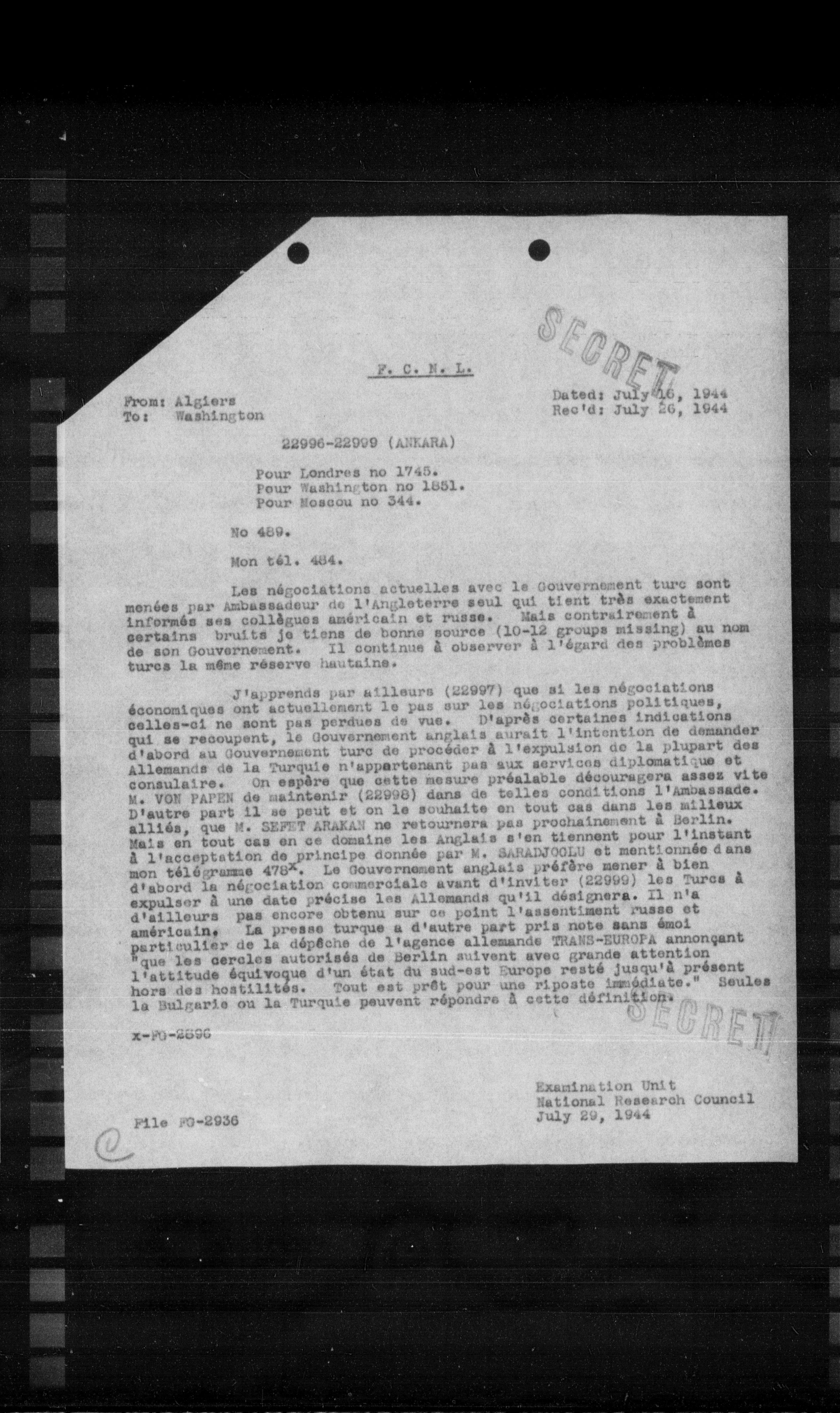 J'apprends par ailleurs (22997) que si les négociations économiques ont actuellement le pas sur les négociations politiques, celles-ci ne sont pas perdues de vue. D'après certaines indications qui se recoupent, le Gouvernement anglais aurait l'intention de demander d'abord au Gouvernement turc de procéder à l'expulsion de la plupart des allemands de la Turquie n'appartenant pas aux services diplomatique et consulaire. On espère que cette mesure préalable découvrira assez vite le TES PAFER de maintenir (22998) dans de telles conditions l'Ambassade. D'autre part il se peut et on le souhaite en tout cas dans les milieux alliés, que M. SEFET ARAKAS ne retournera pas prochainement à Berlin. Mais en tout cas on se domaine les anglais s'en tiennent pour l'instant à l'acceptation de principe donnée par M. SARADJOGU et mentionnée dans mon télégramme 475. Le Gouvernement anglais préfère mener à bien d'abord la négociation commerciale avant d'inviter (22999) les Turcs à expulser à une date précise les allemands qu'il désignera. Il n'a d'ailleurs pas encore obtenu sur ce point l'assentiment russe et américain. La presse turque a d'autre part pris note sans émois particulier de la dépêche de l'agence allemande TRANS-EUROPA annonçant que les dercles autorisés de Berlin suivent avec grande attention l'attitude équivoque d'un état du sud-est Europe reste jusqu'à présent hors des hostilités. Tout est prêt pour une riposte immédiate. Seules la Bulgarie ou la Turquie peuvent répondre à cette définition.