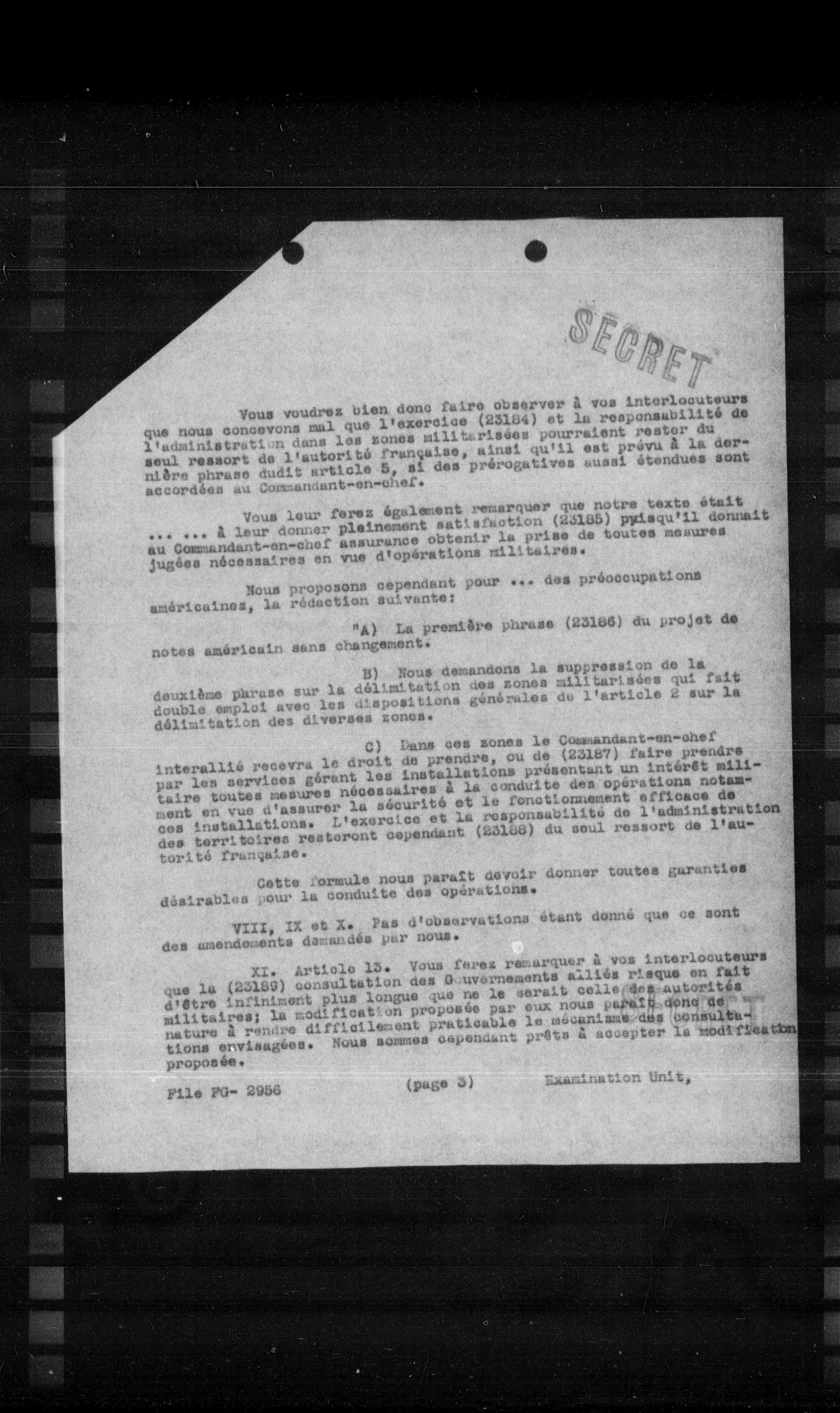 - Vous voudrez bien donc faire observer à vos interlocuteurs que nous concevons mal que l'exercice (23184) et la responsabilité de l'administration dans les zones militarisées pourraient rester du seul ressort de l'autorité française, ainsi qu'il est prévu à la dernière phrase dudit article 5, si des prérogatives aussi étendues sont accordées au Commandant-en-chef.