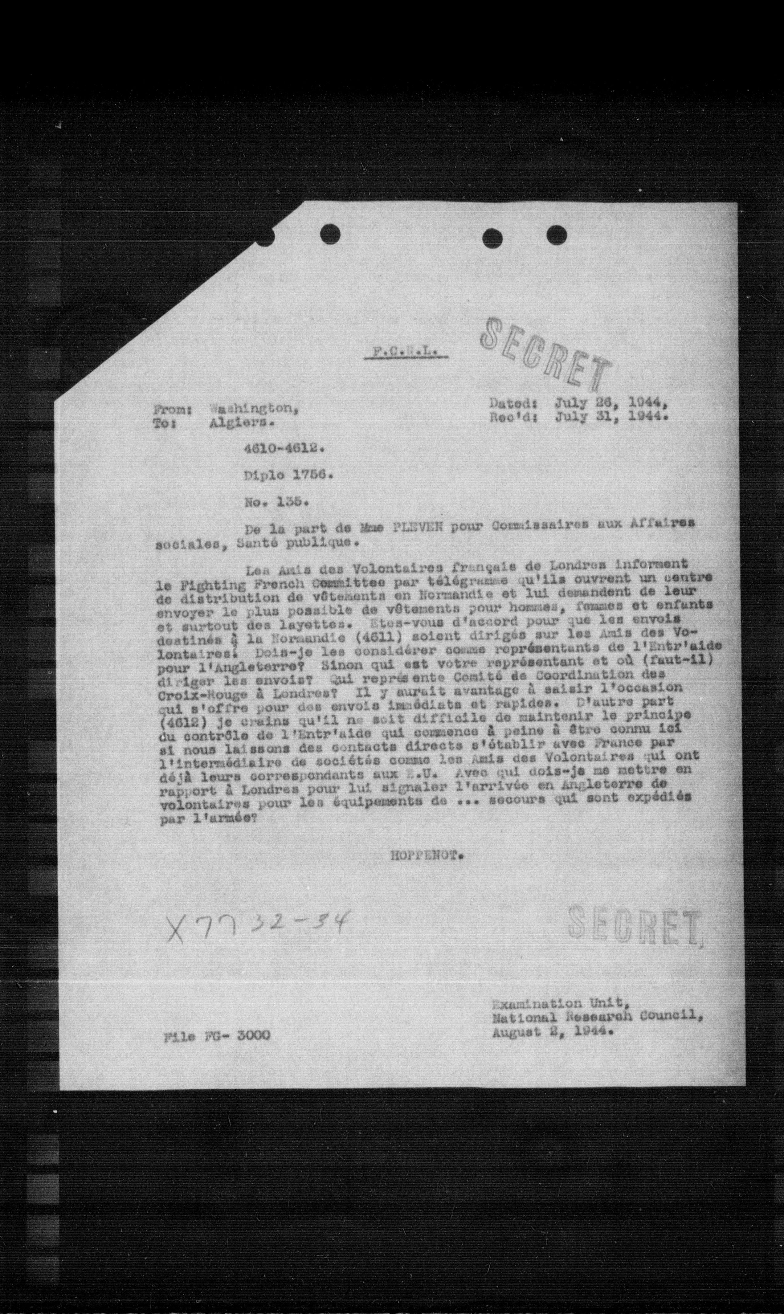 Les Amis des Volontaires français de Londres informent le Fighting French Committee par télégramme qu'ils ouvrent un centre de distribution de vêtements en Normandie et lui demandent de leur envoyer le plus possible de vêtements pour hommes, femmes et enfants et surtout des layettes. Etes-vous d'accord pour que les envois destinés à la Normandie (4611) soient dirigés sur les amis des Volontaires? Dois-je les considérer comme représentants de l'Entr'aide pour l'Angleterre? Sinon qui est votre représentant et où (faut-il) diriger les envois? Qui représente Comité de Coordination des Croix-Rouge à Londres? Il y aurait avantage à saisir l'occasion qui s'offre pour des envois immédiats et rapides. D'autre part (4612) je crains qu'il ne soit difficile de maintenir le principe du contrôle de l'Entr'aide qui commence à peine à être connu ici si nous laissons des contacts directs s'établir avec France par l'intermédiaire de sociétés comme les Amis des Volontaires qui ont déjà leurs correspondants aux E.G. Avec qui dois-je me mettre en rapport à Londres pour lui signaler l'arrivée en Angleterre de volontaires pour les équipements de ... secours qui sont expédiés par l'armée?