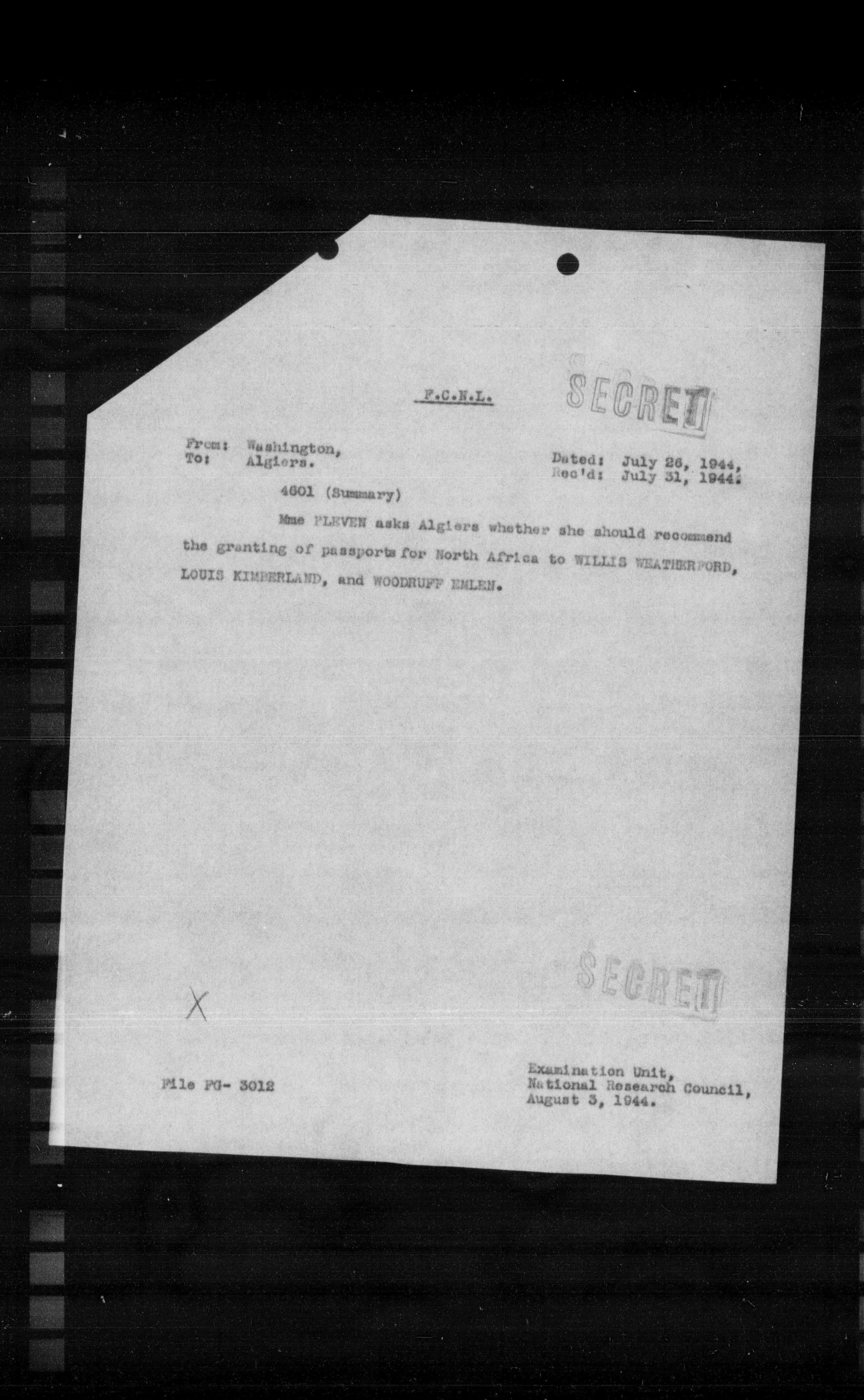 Mme FLEVEN asks Algiers whether she should recommend the granting of passports for North Africa to WILLIS WEATHERFORD, LOUIS KINDERLAND, and WOODRUFF ENLEN.