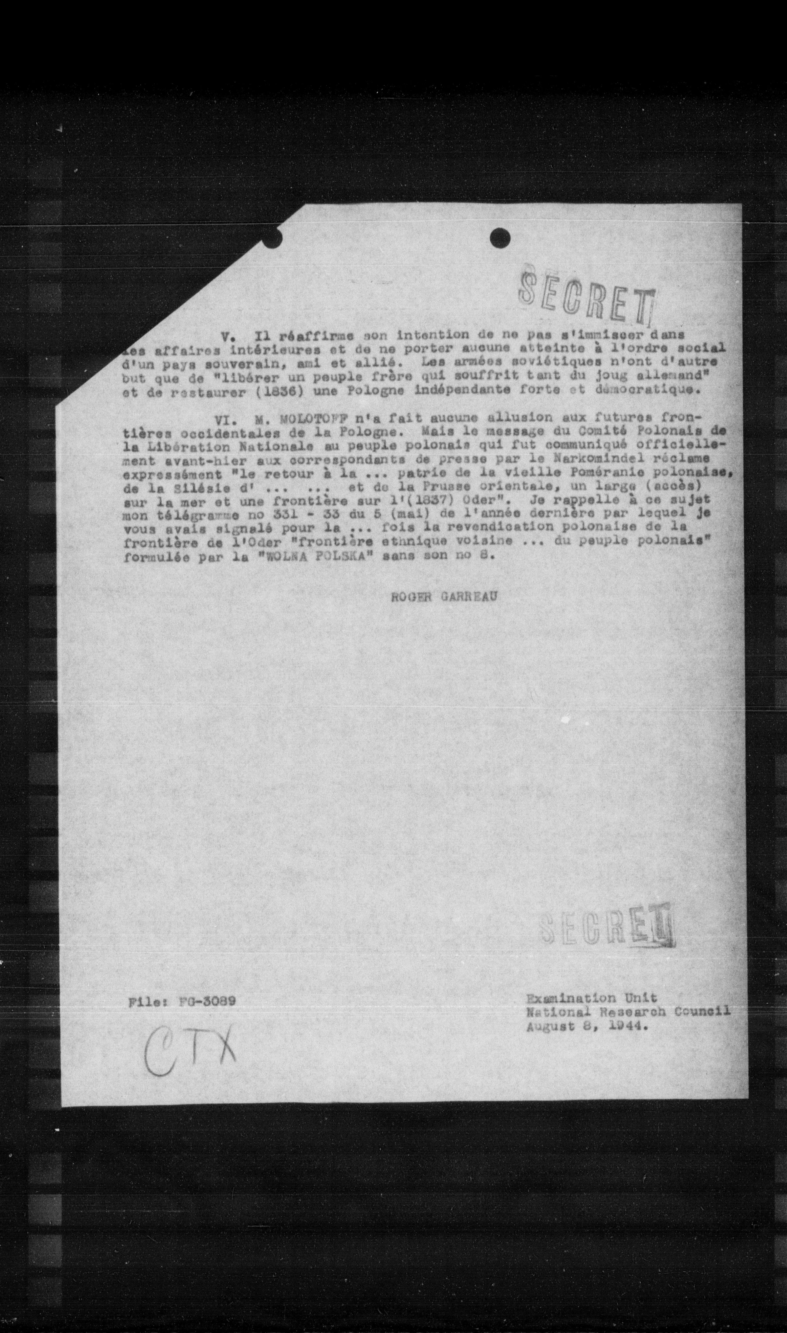 VI. M. MOLOTOFF n'a fait aucune allusion aux futures frontières occidentales de la Pologne. Mais le message du Comité Polonais de la Libération Nationale au peuple polonais qui fut communiqué officiellement avant-nice aux correspondants de presse par le Narcissisme roulisme expressément "le retour à la ... patrie de la vieille Poméranie polonaise, de la Silésie d' ... et de la Prusse orientale, un large (accès) sur la mer et une frontière sur l'(1837) Oder". Je rappelle à ce sujet mon téléphone no 331 - 33 du 5 (mai) de l'année dernière par lequel je vous avais signalé pour la ... fois la revendication polonaise de la frontière de l'Oder "frontière étatique voisine ... du peuple polonais" formulée par la "BOLNA POLSKA" sans son no 8.