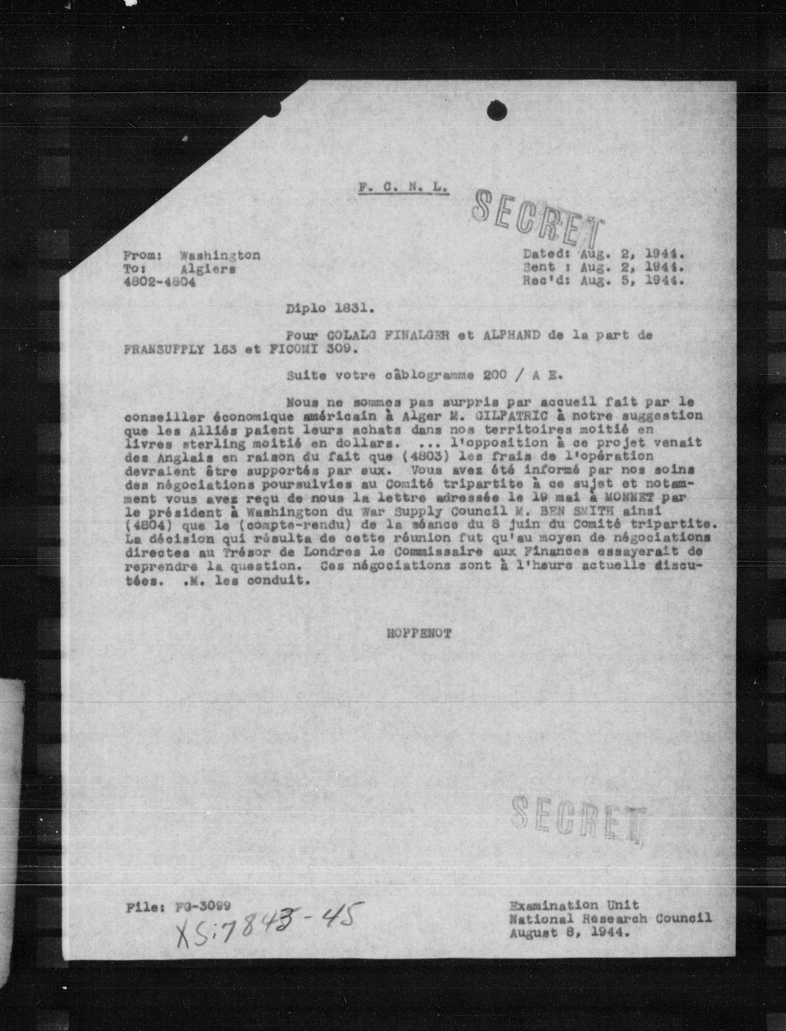 Nous ne sommes pas surpris par accueil fait par le conseiller économique américain à Alger M. GILPATRIC à notre suggestion que les Alliés paient leurs achats dans nos territoires moitiés en livres sterling moitiés en dollars. ... l'opposition à ce projet venait des Anglais en raison du fait que (4803) les frais de l'opération devraient être supportés par eux. Vous avez été informé par nos soins des négociations poursuivies au Comité tripartite à ce sujet et notamment vous avez reçu de nous la lettre adressée le 19 mai à MONNET par le président à Washington du War Supply Council M. BEN SMITH ainsi (4804) que le (compte-rendu) de la séance du 8 juin du Comité tripartite. La décision qui résulta de cette réunion fut qu'au moyen de négociations directes au Trésor de Londres le Commissaire aux Finances essayerait de reprendre la question. Ces négociations sont à l'heure actuelle discutées. M. les conduit.