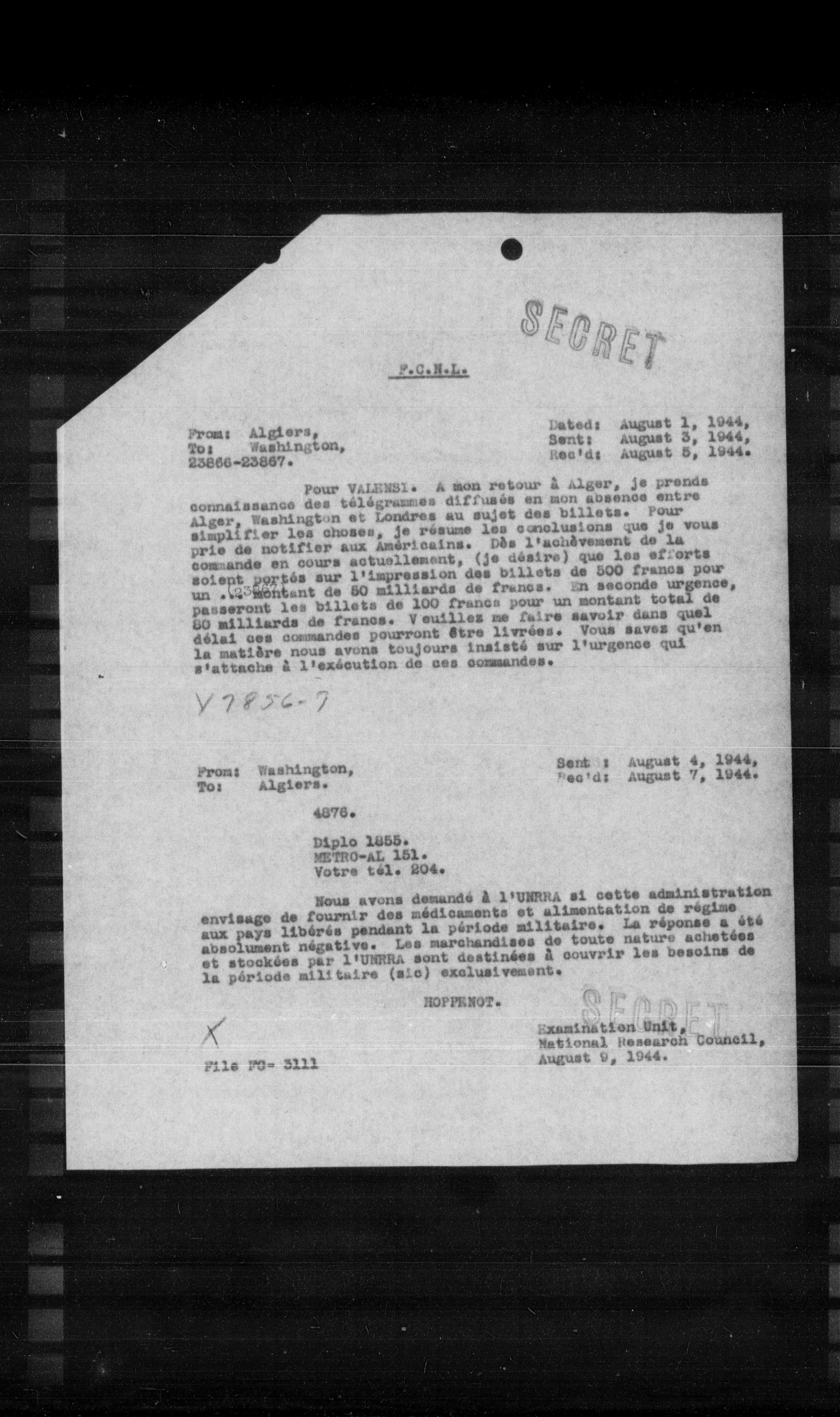 **From:** Algiers, **To:** Washington, **Date:** August 1, 1944, **Date:** August 3, 1944.