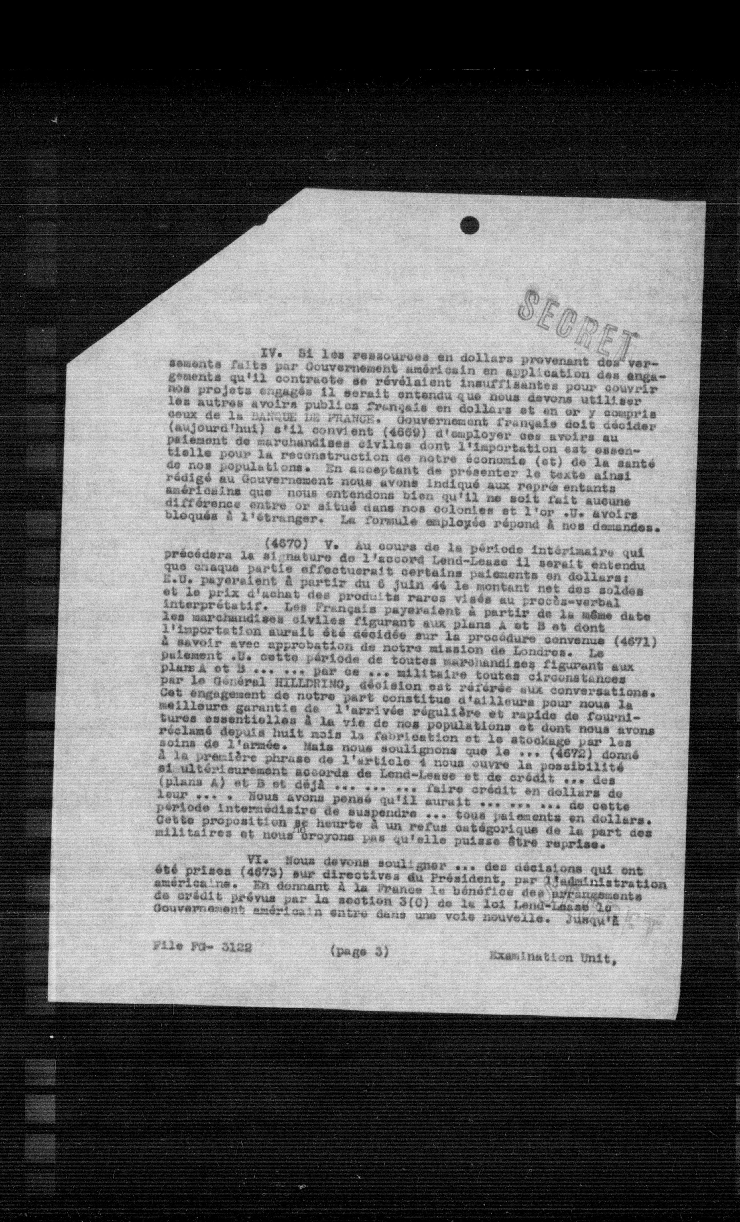 - IV. Si les ressources en dollars provenant des versements faits par Gouvernement américain en application des engagements qu'il contrainte de révéler insuffisantes pour couvrir nos projets engagés, il serait entendu que nous devions utiliser les autres avoirs publics français en dollars et en or y compris ceux de la **BAGURE DE FRANCE**. Gouvernement français doit décider (aujourd'hui) s'il convient (4669) d'employer ces avoirs au paiement de marchandises civiles dont l'importation est essentielle pour la reconstruction de notre économie (et) de la santé de nos populations. En acceptant de présenter le texte ainsi rédigé au Gouvernement, nous avons indiqué aux représentants américains que nous entendons bien qu'il ne soit fait aucune différence entre or situé dans nos colonies et l'or. C. avoirs bloqués à l'étranger. La formule employée répond à nos demandes.