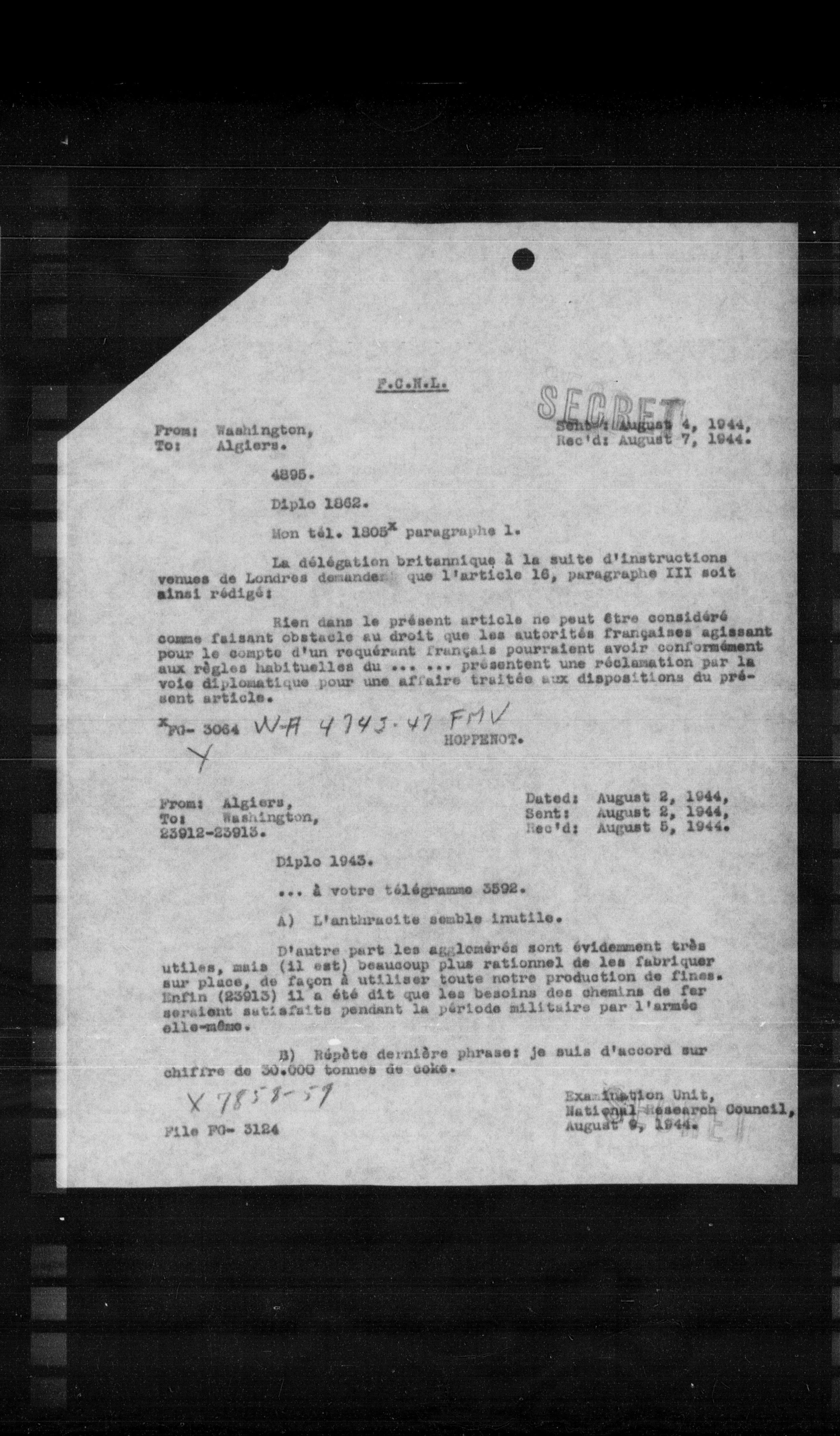 **From:** Algiers, **To:** Washington, **Date:** August 2, 1944, **Rec'd:** August 8, 1944.