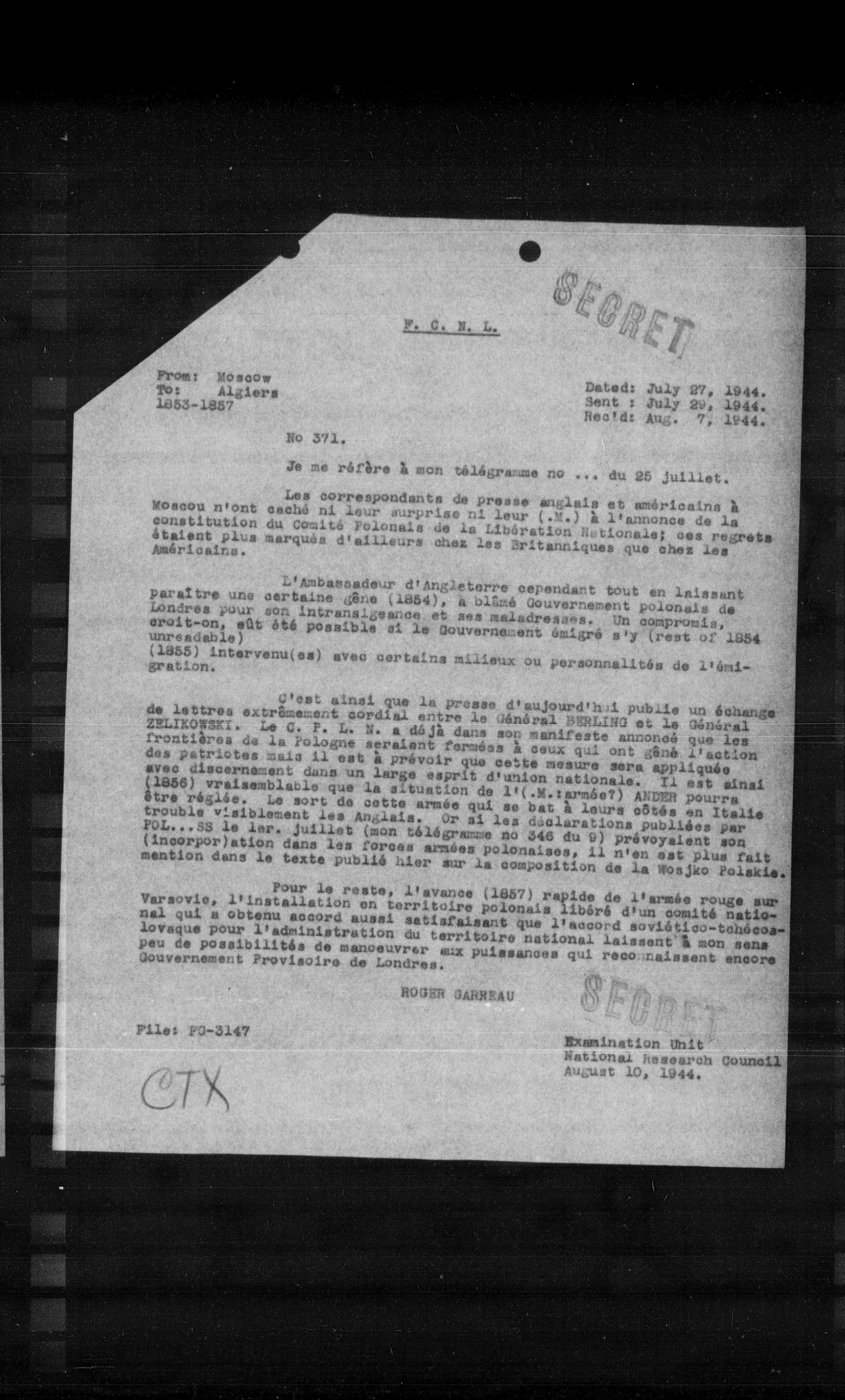 C'est ainsi que la presse d'aujourd'hui publie un échange de lettres extrêmement cordial entre le Général MERLING et le Général ZELIKOWSKI. Le G. P. L. N. a déjà dans son manifeste annoncé que les frontières de la Pologne seraient fermées à ceux qui ont gêné l'action des patriotes mais il est à prévoir que cette mesure sera appliquée avec discernement dans un large esprit d'union nationale. Il est ainsi (1856) vraisemblable que la situation de l'(M.'armée?) ANDER pourra être réglée. Le sort de cette armée qui se bat à leurs côtés en Italie trouble visiblement les Anglais. Or si les déclarations publiées par POL... Et le Ier. juillet (mon télégramme no 346 du 9) prévoyaient son (incorpor)ation dans les forces armées polonaises, il n'en est plus fait mention dans le texte publié hier sur la composition de la Mosjko Polskie.