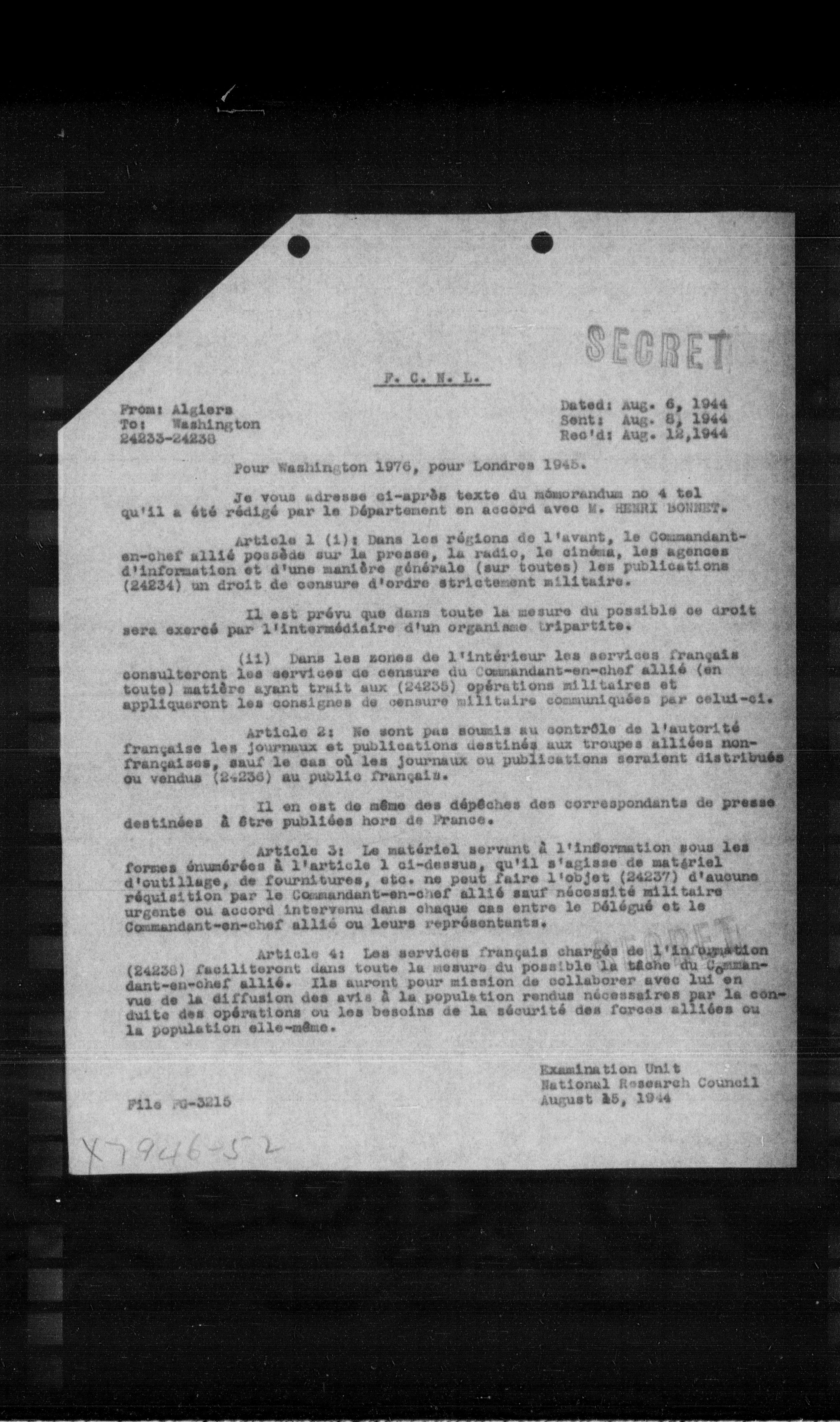 **Article 1 (i):** Dans les régions de l'avant, le Commandant-en-chef allié possède sur la presse, la radio, le cinéma, les agences d'information et d'une manière générale (sur toutes) les publications (24234) un droit de censure d'ordre strictement militaire.