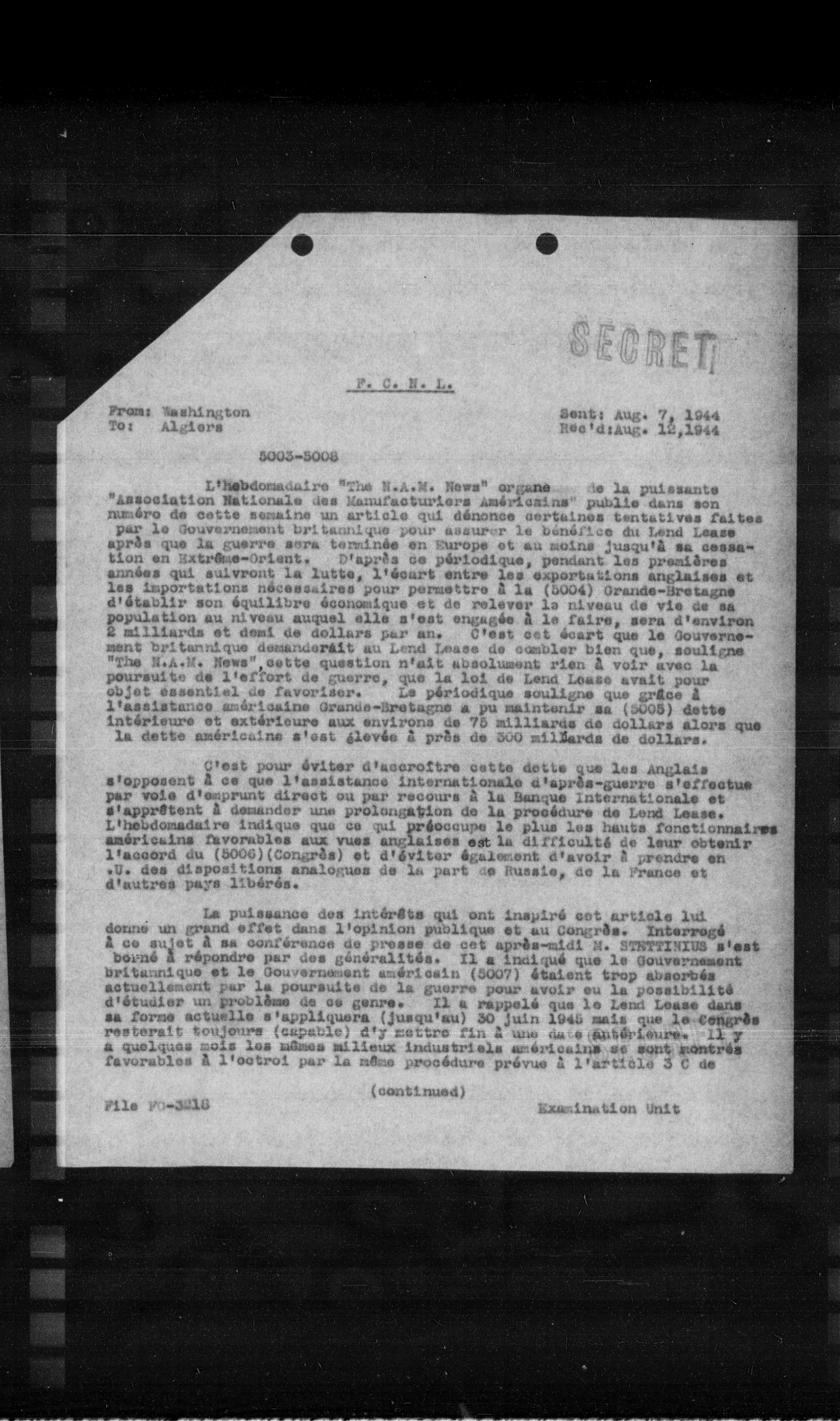 La puissance des intérêts qui ont inspiré cet article lui donne un grand effet dans l'opinion publique et au Congrès. Interrogé à ce sujet à sa conférence de presse de cet après-midi M. STNITZNUS s'est banné à répondre par des généralités. Il a indiqué que le Gouvernement britannique et le Gouvernement américain (5007) étaient trop absorbés actuellement par la poursuite de la guerre pour avoir eu la possibilité d'étudier un problème de ce genre. Il a rappelé que le Lend Lease dans sa forme actuelle s'appliquera (jusqu'au) 30 juin 1945 mais que le Congrès resterait toujours (capable) d'y mettre fin à une date antérieure. Il y a quelques mois les mêmes milieux industriels américains se sont montrés favorables à l'octroi par la même procédure prévue à l'article 3 C de