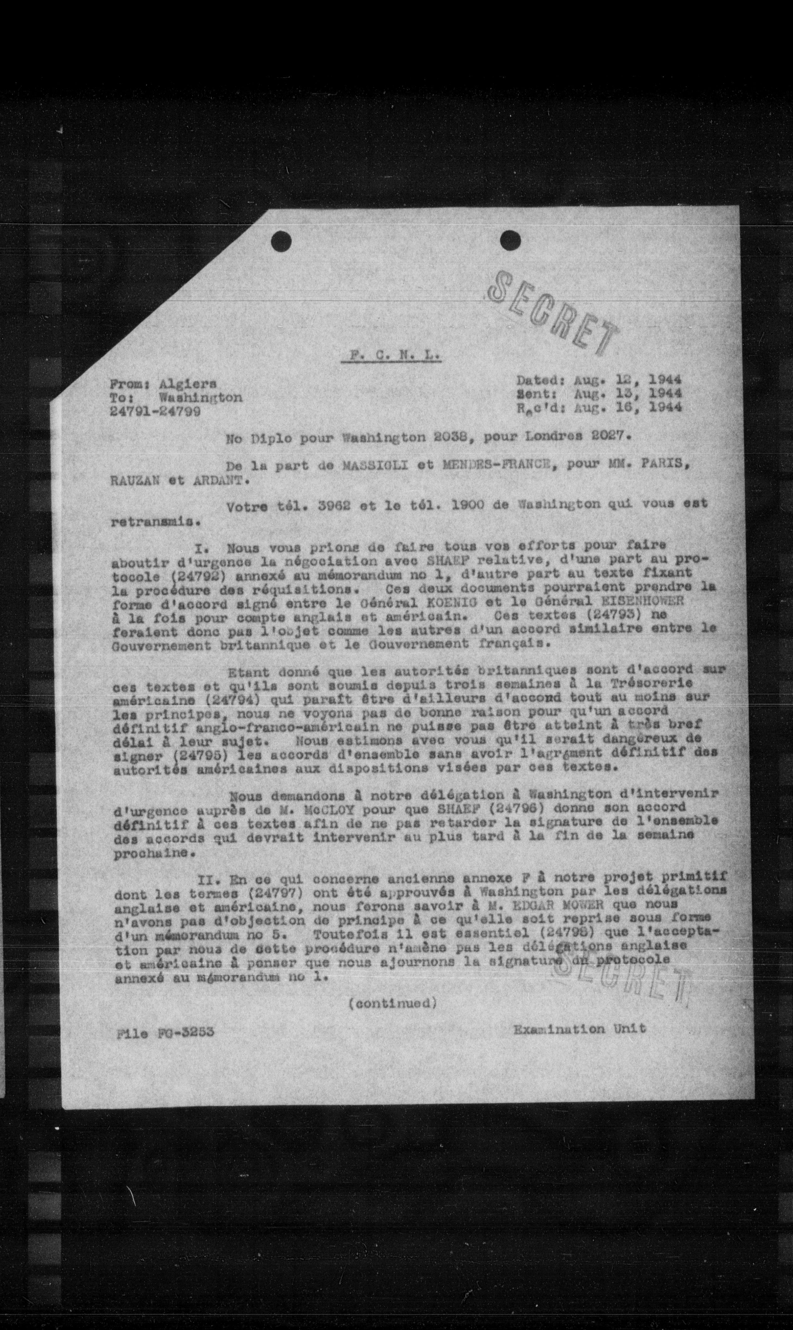 **I.** Nous vous prions de faire tous vos efforts pour faire aboutir d'urgence la négociation avec SHARP relative, d'une part au protocole (24792) annexé au mémorandum no 1, d'autre part au texte fixant la procédure des réquisitions. Ces deux documents pourraient prendre la forme d'accord signé entre le Général KUENIO et le Général KIERENOWER à la fois pour compte anglais et américain. Ces textes (24793) ne feraient donc pas l'objet comme les autres d'un accord similaire entre le Gouvernement britannique et le Gouvernement français.