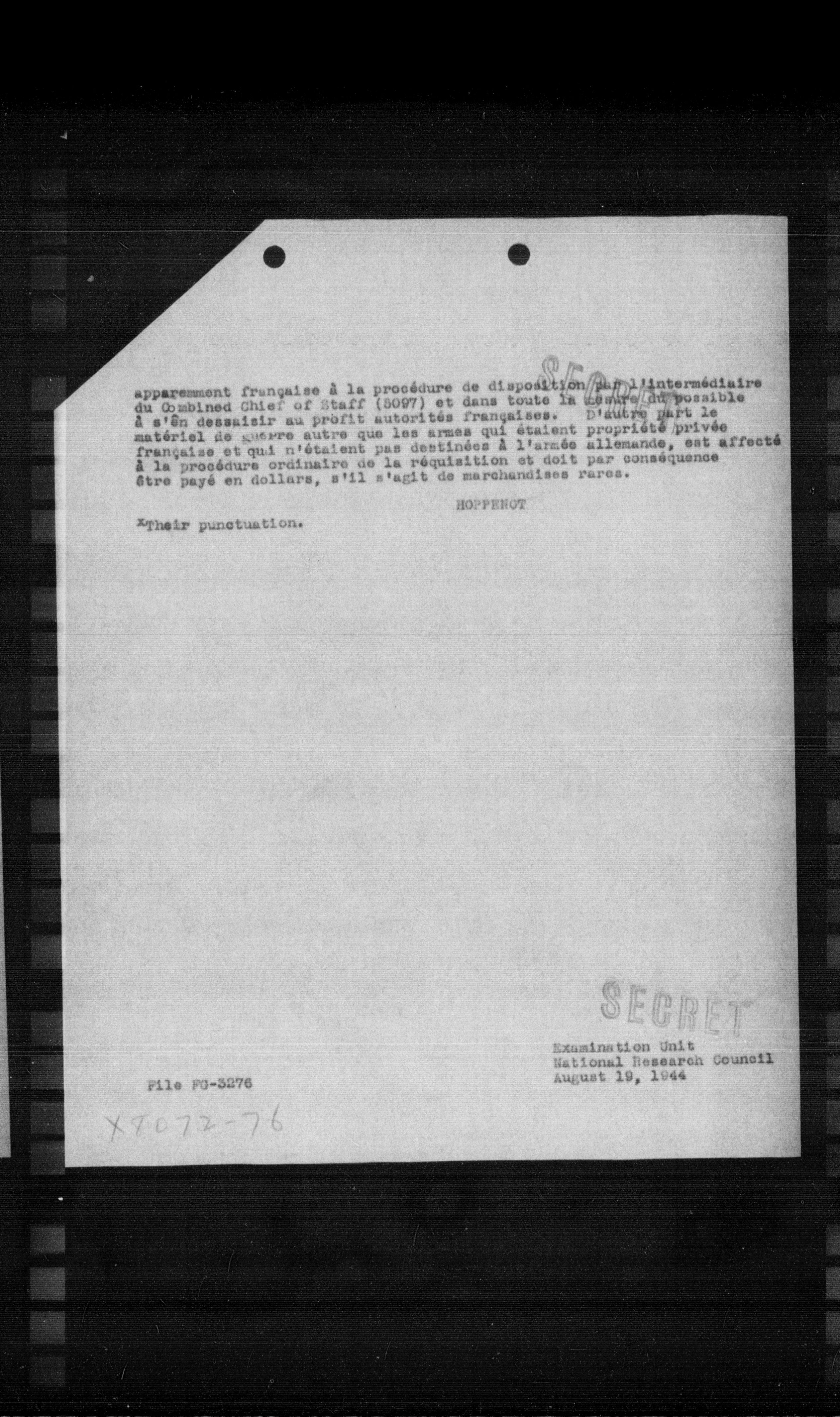 - apparemment française à la procédure de disposition par l'intermédiaire du Combined Chief of Staff (COST) et dans toute la mesure du possible à s'en dessaisir au profit autorités françaises. D'autre part le matériel de guerre autre que les armes qui étaient propriété privée française et qui n'étaient pas destinées à l'armée allemande, est affecté à la procédure ordinaire de la réquisition et doit par conséquence être payé en dollars, s'il s'agit de marchandises rares.