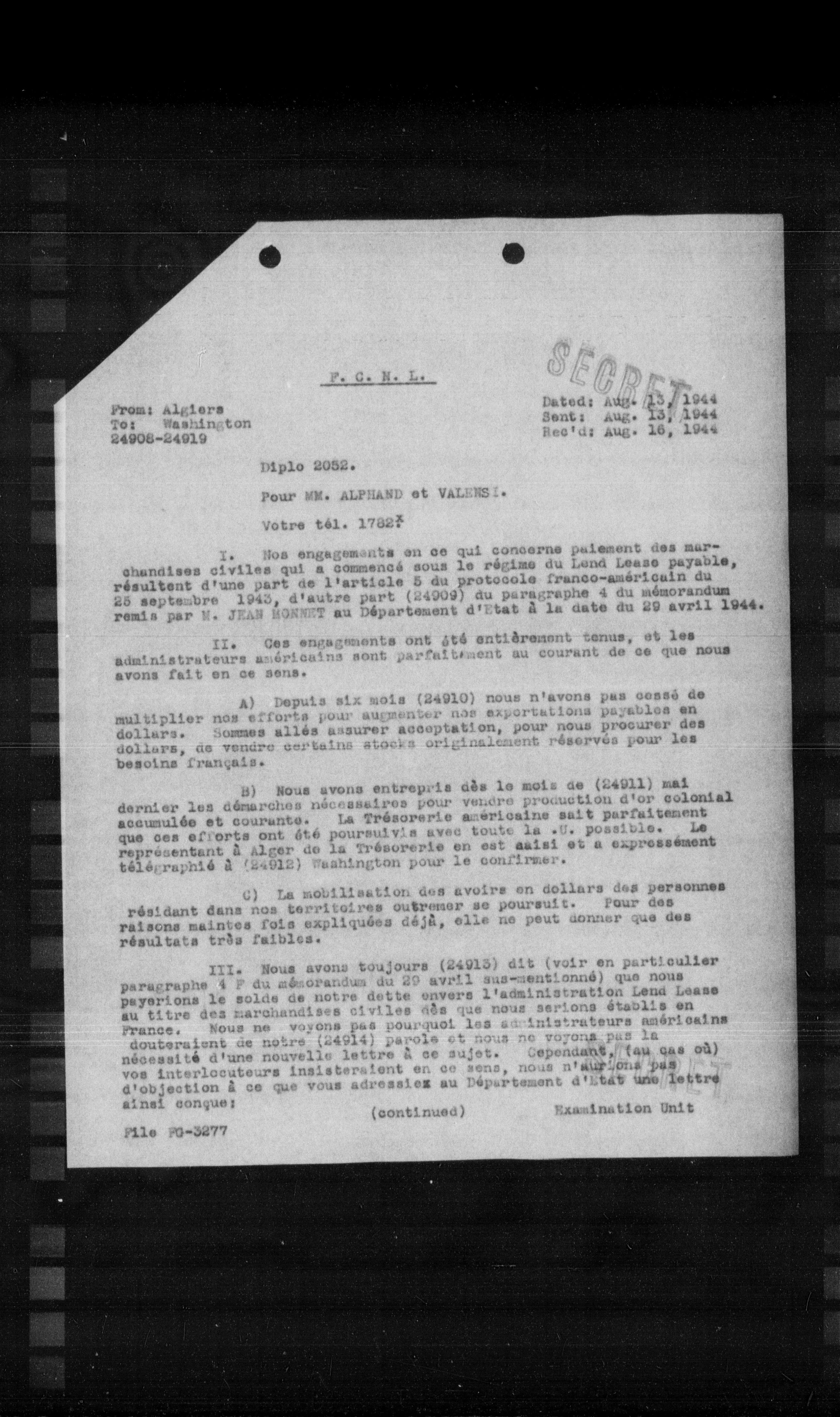 I. Nos engagements en ce qui concerne paiement des marchandises civiles qui a commencé sous le régime du Lord Lease payable, résultent d'une part de l'article 5 du protocole franco-américain du 25 septembre 1942, d'autre part (24909) du paragraphe 4 du mémorandum remis par H. JEAN ROBERT au Département d'Etat à la date du 29 avril 1944.