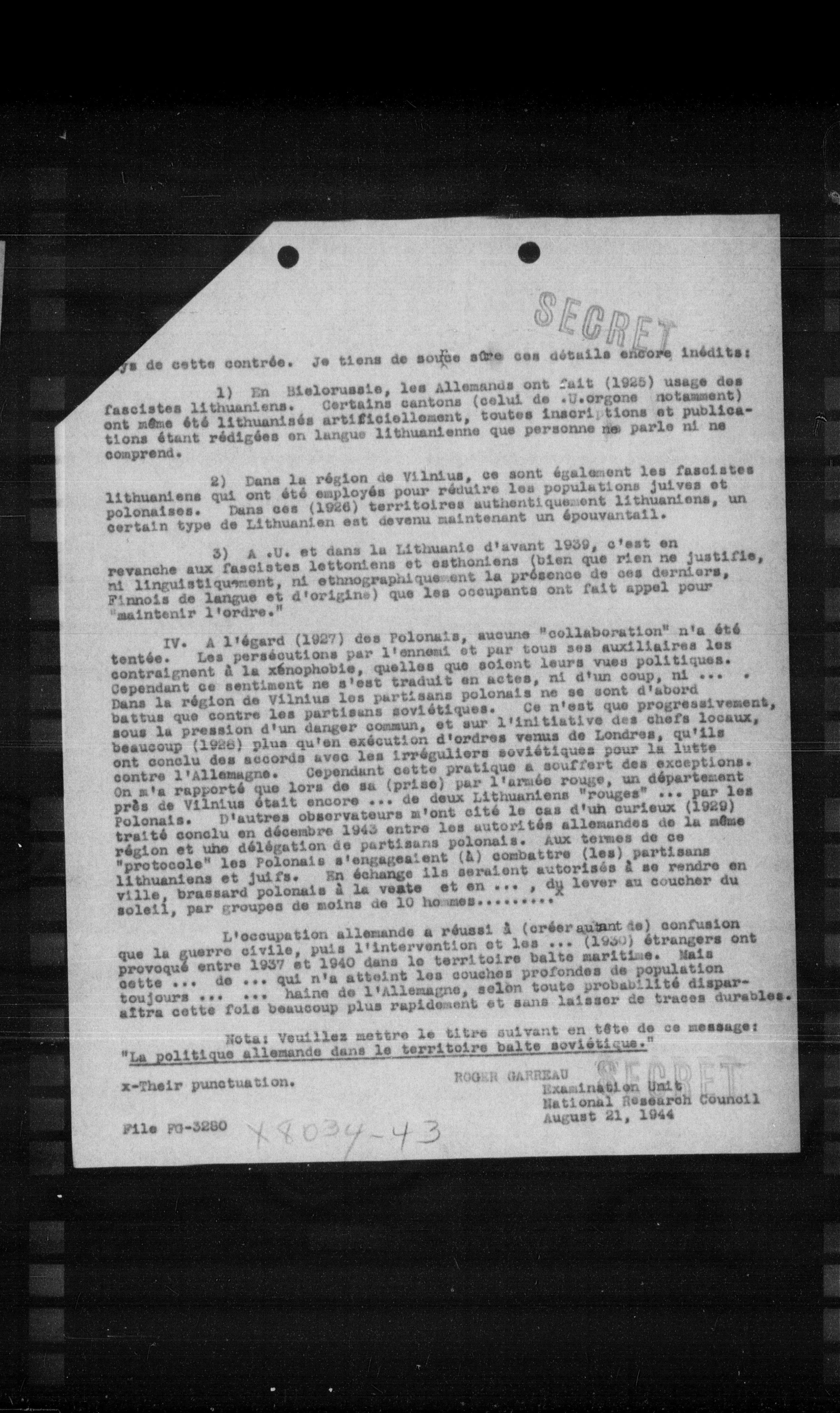 Nota: Veuillez mettre le titre suivant en tête de ce message: "La politique allemande dans le territoire balte soviétique."