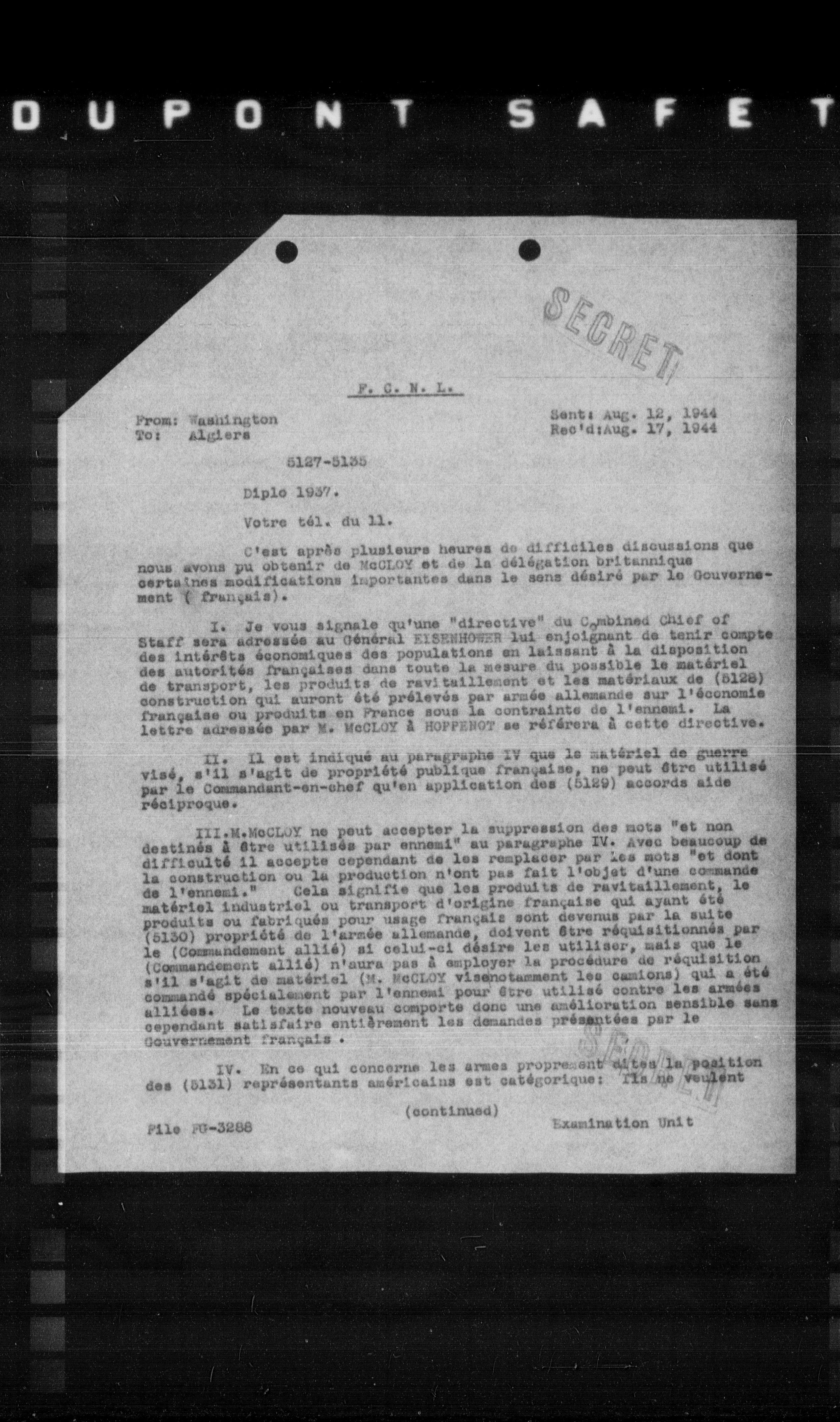 III. M. McCLOY ne peut accepter la suppression des mots "et non destinés à être utilisés par ennemi" au paragraphe IV. Avec beaucoup de difficulté il accepte cependant de les remplacer par les mots "et dont la construction ou la production n'ont pas fait l'objet d'une commande de l'ennemi." Cela signifie que les produits de ravitaillement, le matériel industriel ou transport d'origine française qui ayant été produits ou fabriqués pour usage français sont devenus par la suite (8130) propriété de l'armée allemande, doivent être réquisitionnés par le (Commandement allié) si celui-ci désire les utiliser, mais que le (Commandement allié) n'aura pas à employer la procédure de réquisition s'il s'agit de matériel (M. McCLOY visentamment les camions) qui a été commandé spécialement par l'ennemi pour être utilisé contre les armées alliées. Le texte nouveau comporte donc une amélioration sensible sans cependant satisfaire entièrement les demandes présentées par le Gouvernement français.