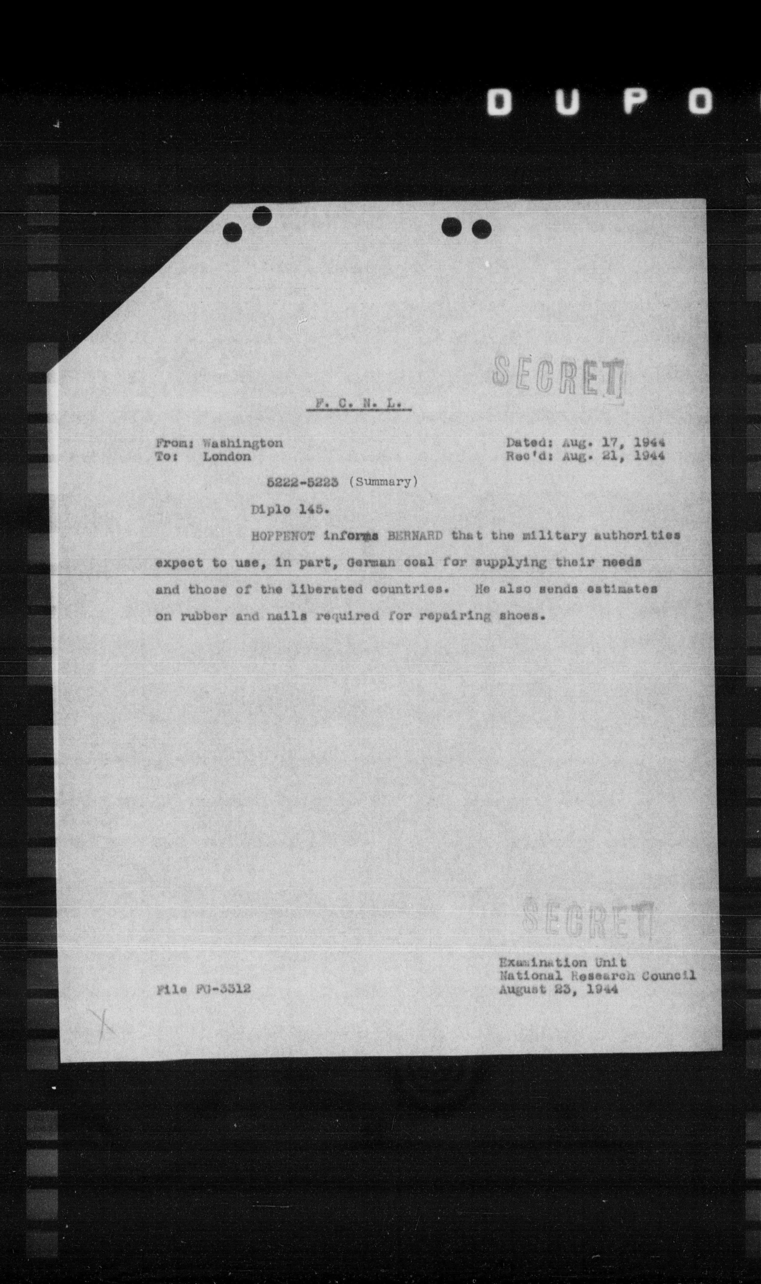 HOPEBOT informs BERNARD that the military authorities expect to use, in part, German coal for supplying their needs and those of the liberated countries. He also sends estimates on rubber and nails required for repairing shoes.