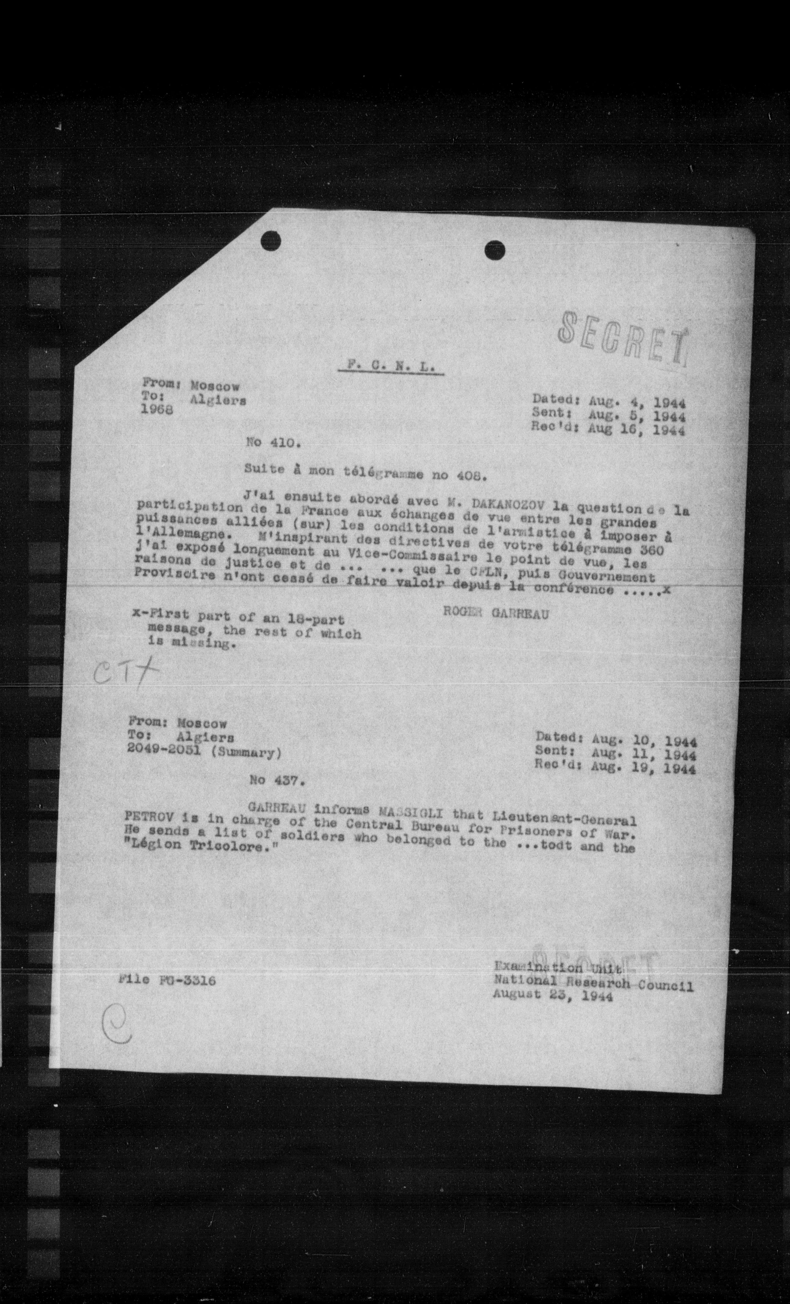 **From:** Moscow **To:** Algiers **Date:** Aug. 10, 1944 **Date:** Aug. 11, 1944 **Rec'd:** Aug. 19, 1944