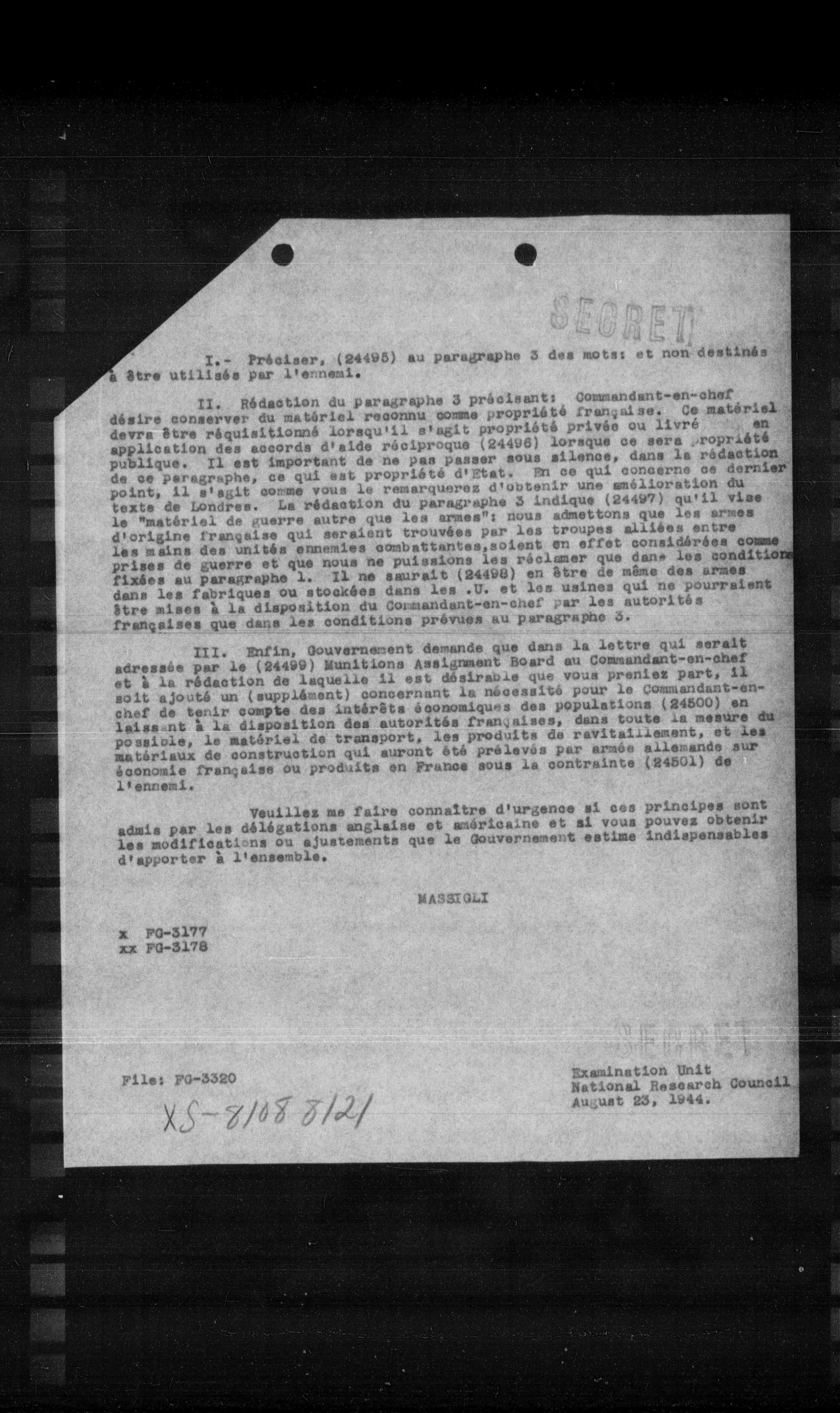 II. Rédaction du paragraphe 3 précisant: Commandant-en-chef désire conserver du matériel reconnu comme propriété française. Ce matériel devra être réquisitionné lorsqu'il s'agit propriété privée ou livré en application des accords d'aide réciproque (24496) lorsque ce sera propriété publique. Il est important de ne pas passer sous silence, dans la rédaction de ce paragraphe, ce qui est propriété d'Etat. En ce qui concerne ce dernier point, il s'agit comme vous le remarquerez d'outenir une amélioration du texte de Londres. La rédaction du paragraphe 3 indique (24497) qu'il vise le "matériel de guerre autre que les armes": nous admettons que les armes d'origine française qui seraient trouvées par les troupes alliées entre les mains des unités ennemies combattantes, soient en effet considérées comme prises de guerre et que nous ne puissions les réclamer que dans les conditions fixées au paragraphe 1. Il ne saurait (24498) en être de même des armes dans les fabriques ou stockées dans les .0. et les usines qui ne pourraient être mises à la disposition du Commandant-en-chef par les autorités françaises que dans les conditions prévues au paragraphe 3.