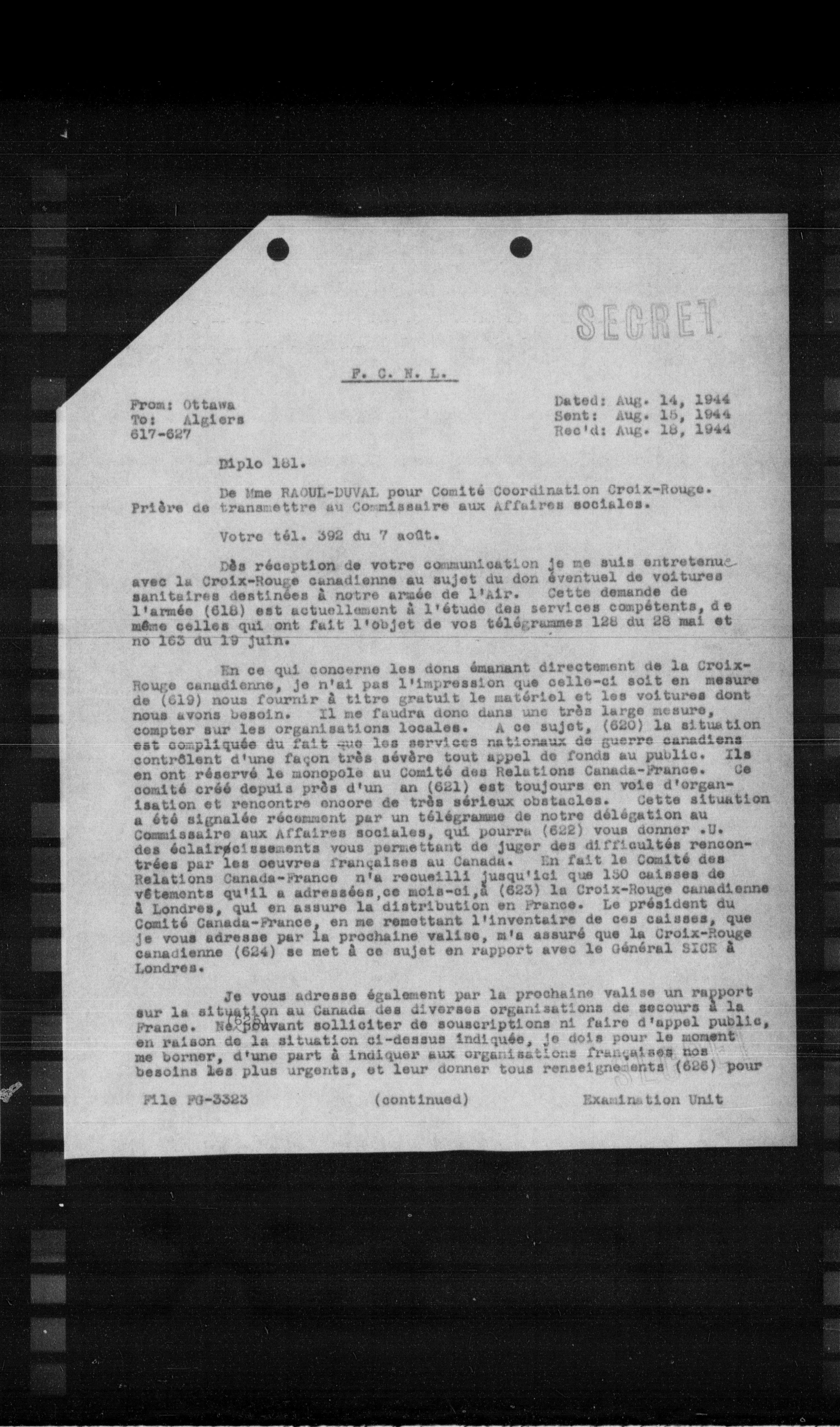 En ce qui concerne les dons émanant directement de la Croix-Rouge canadienne, je n'ai pas l'impression que celle-ci soit en mesure de (619) nous fournir à titre gratuit le matériel et les voitures dont nous avons besoin. Il me faudra donc dans une très large mesure, compter sur les organisations locales. À ce sujet, (620) la situation est compliquée du fait que les services nationaux de guerre canadiens contrôlent d'une façon très sévère tout appel de fonds au public. Ils en ont réservé le monopole au Comité des Relations Canada-France. Ce comité créé depuis près d'un an (621) est toujours en voie d'organisation et rencontre encore de très sérieux obstacles. Cette situation a été signalée récemment par un télégramme de notre délégation au Commissaire aux Affaires sociales, qui pourra (622) vous donner à l'idée éclairée des éclairés. Les deux parties, qui pourront, pour les œuvres françaises au Canada, en fait le Comité des Relations Canada-France n'a recueilli jusqu'ici que 150 caisses de vêtements qu'il a adressées, ce mois-ci, à (623) le Croix-Rouge canadienne à Londres, qui en assure la distribution en France. Le président du Comité Canada-France, en me remettant l'inventaire de ces caisses, que je vous adresse par la prochaine valise, m'a assuré que le Croix-Rouge canadienne (624) se met à ce sujet en rapport avec le Général SIGE à Londres.
