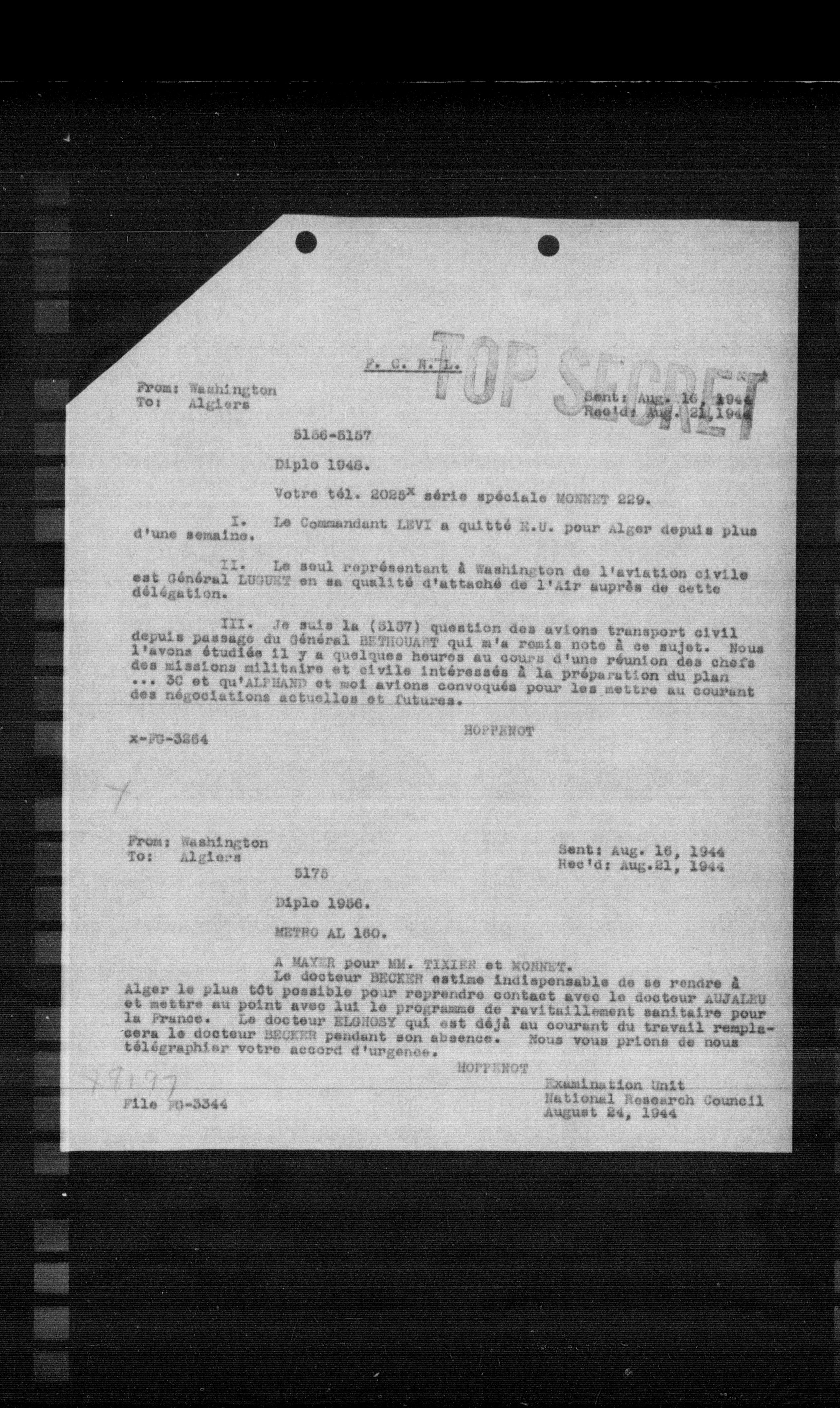 III. Je suis la (3137) question des avions transport civil depuis passage du Général BETHOUART qui m'a remis note à ce sujet. Nous l'avons étudiée il y a quelques heures au cours d'une réunion des chefs des missions militaire et civile intéressés à la préparation du plan 3C et qu'ALPHARD et moi avions convoqués pour les mettre au courant des négociations actuelles et futures.