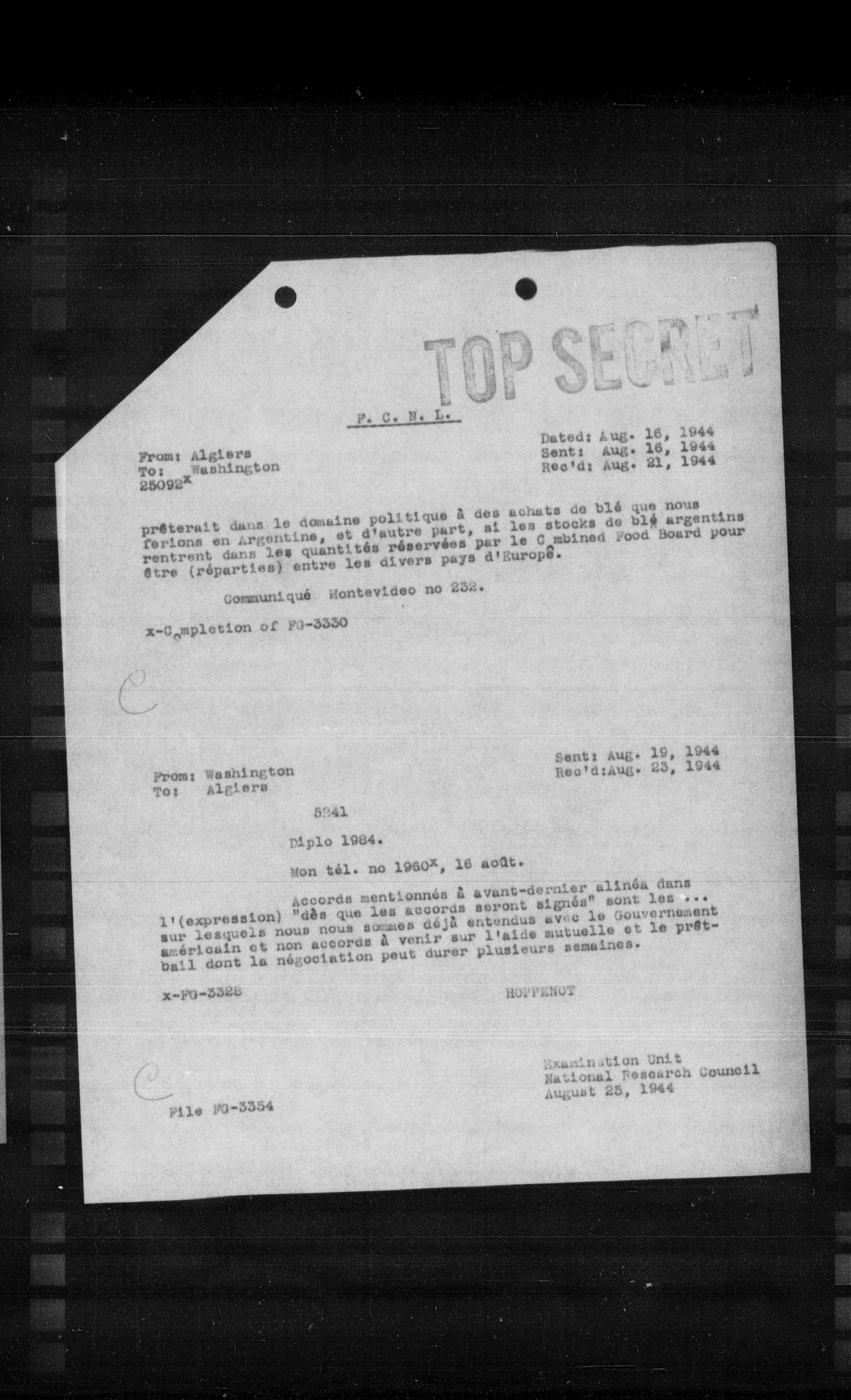 **From:** Washington **To:** Algiers **Date:** Aug. 19, 1944 **Date:** Aug. 23, 1944