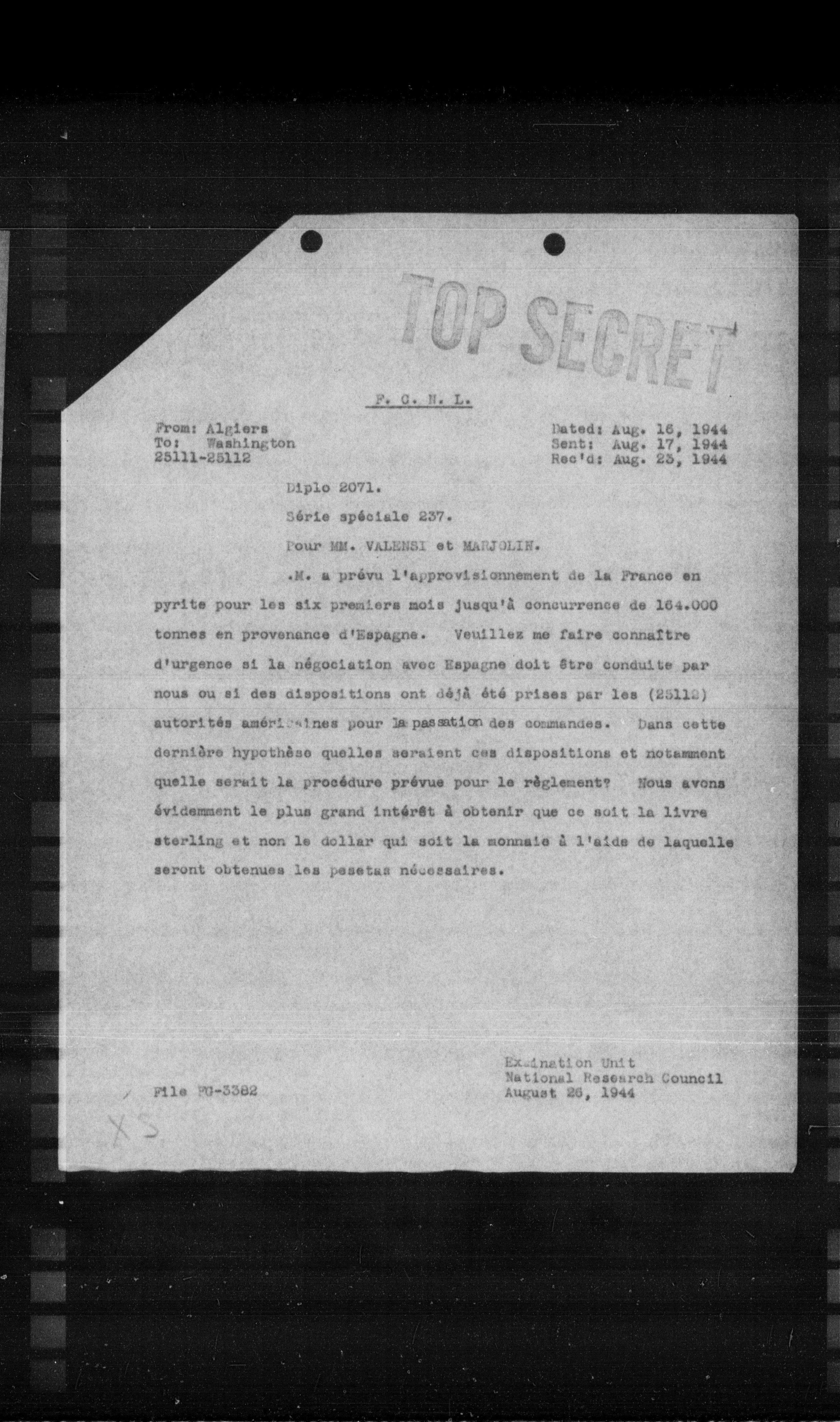 M. a prévu l'approvisionnement de la France en pyrite pour les six premiers mois jusqu'à concurrence de 164.000 tonnes en provenance d'Espagne. Veuillez me faire connaître d'urgence si la négociation avec Espagne doit être conduite par nous ou si des dispositions ont déjà été prises par les (28112) autorités américaines pour la pesation des commandes. Dans cette dernière hypothèse quelles seraient ces dispositions et notamment quelle serait la procédure prévue pour le règlement? Nous avons évidement le plus grand intérêt à obtenir que ce soit la livre sterling et non le dollar qui soit la monnaie à l'aide de laquelle seront obtenues les pesetas nécessaires.
