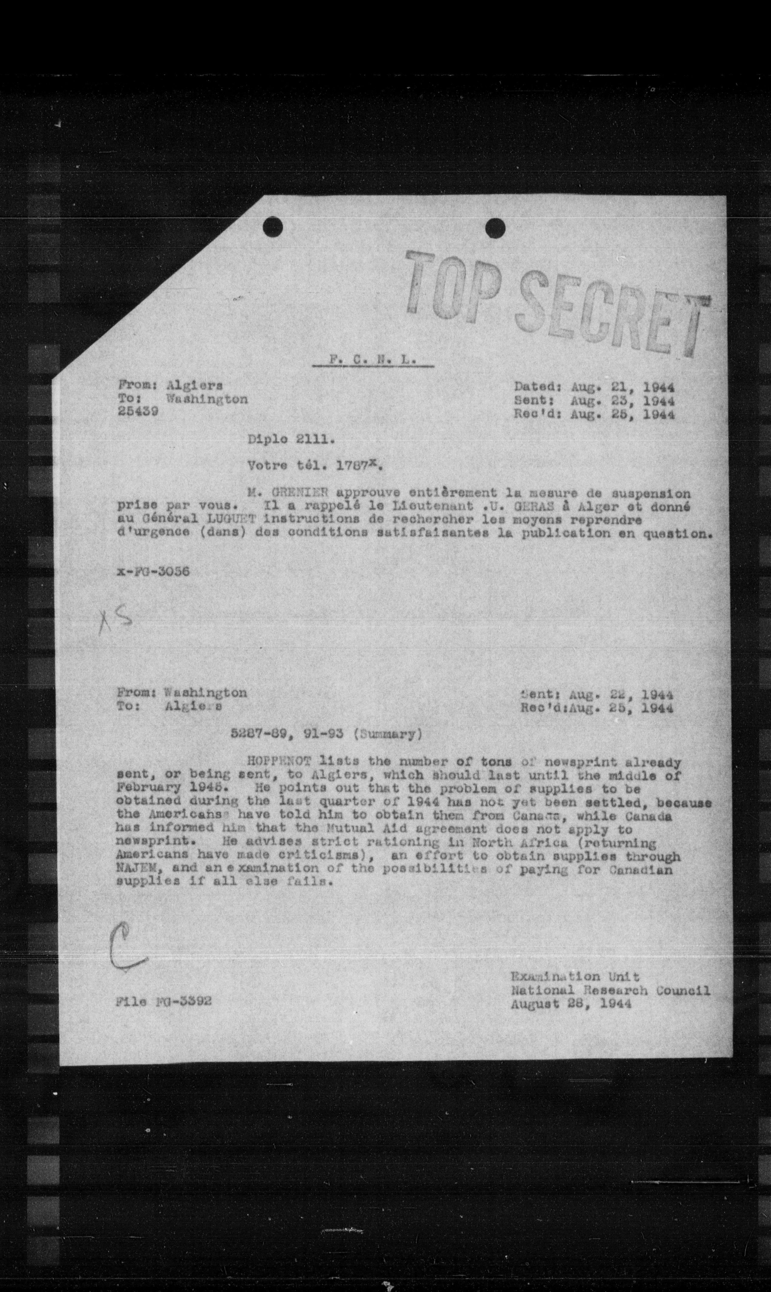 HOPPEROT lists the number of tons of newsprint already sent, or being sent, to Algiers, which should last until the middle of February 1948. He points out that the problem of supplies to be obtained during the last quarter of 1944 has not yet been settled, because the Americans have told him to obtain them from Canada, while Canada has informed him that the Mutual Aid agreement does not apply to newsprint. He advises strict rationing in North Africa (returning Americans have made criticisms), an effort to obtain supplies through WAFEN, and an examination of the possibilities of paying for Canadian supplies if all else fails.