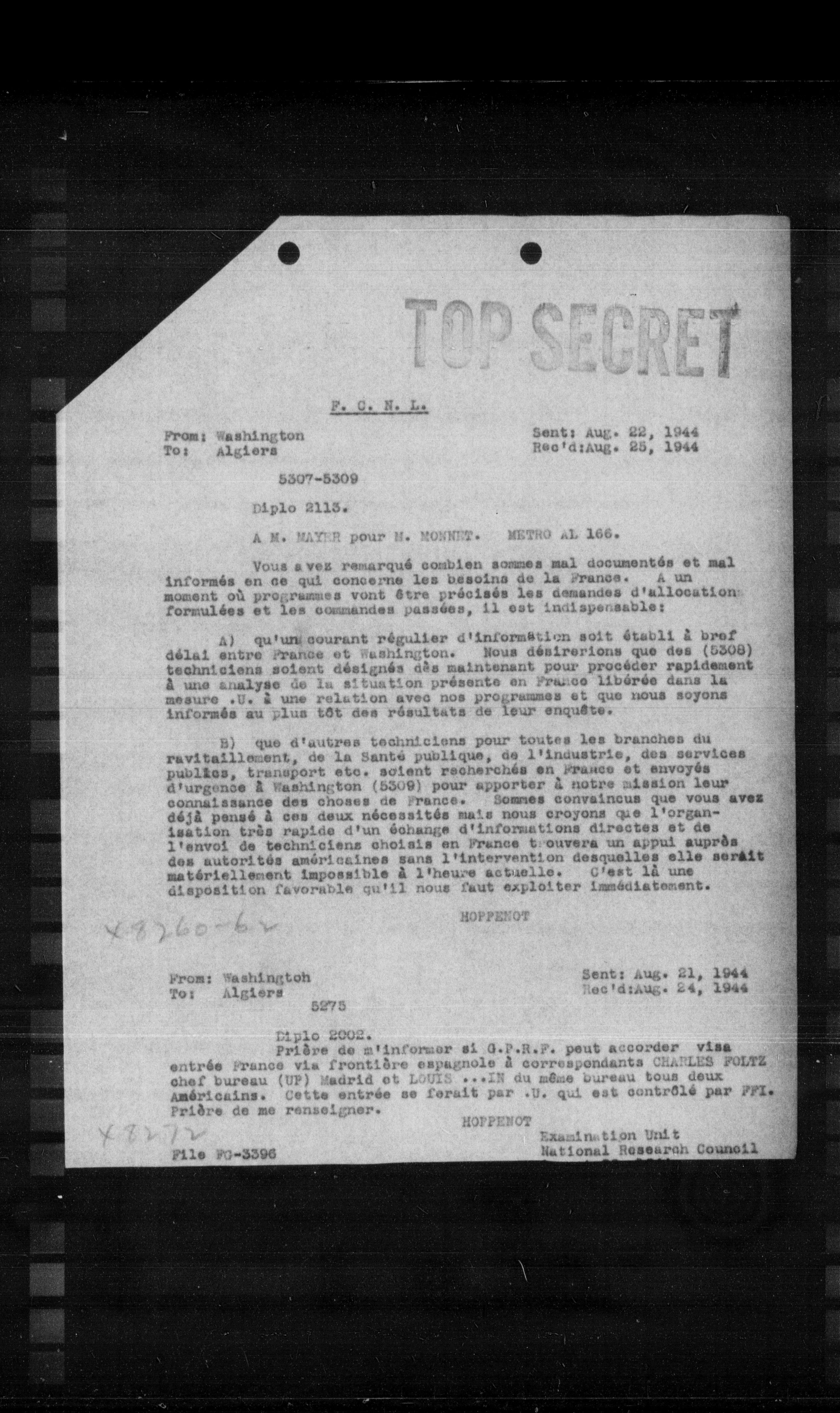 A) qu'un courant régulier d'information soit établi à bref délai entre France et Washington. Nous désirerions que des (5308) techniciens soient désignés dès maintenant pour procéder rapidement à une analyse de la situation présente en France libérée dans la mesure d. à une relation avec nos programmes et que nous soyons informés au plus tôt des résultats de leur enquête.