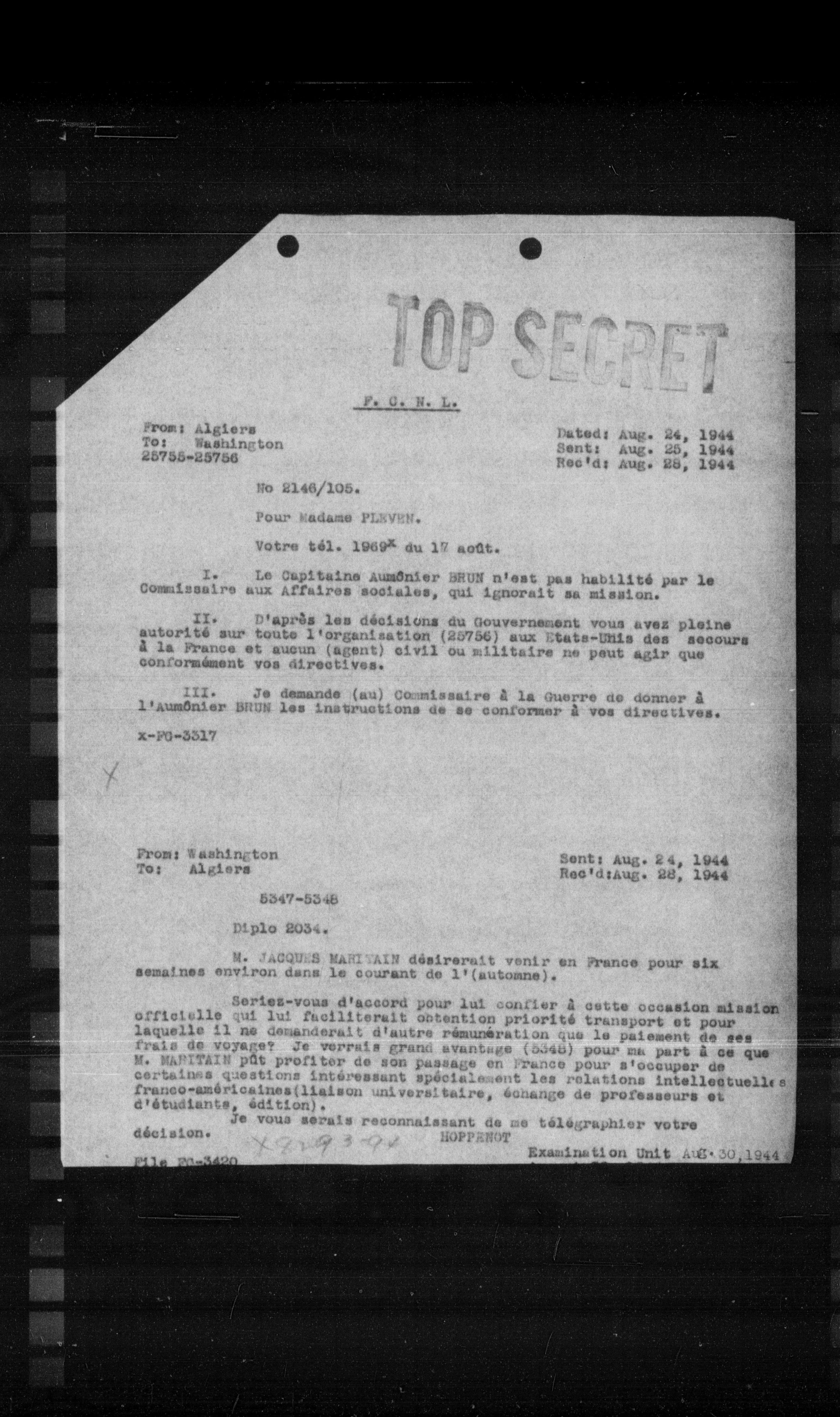 Seriez-vous d'accord pour lui confier à cette occasion mission officielle qui lui faciliterait attention priorité transport et pour laquelle il ne demanderait d'autre rémunération que le paiement de ses frais de voyage? Je verrais grand avantage (5348) pour ma part à ce que M. MARITAIN pût profiter de son passage en France pour s'occuper de certaines questions intéressant spécialement les relations intellectuelles franco-américaines (liaison universitaire, échange de professeurs et d'étudiants, édition).