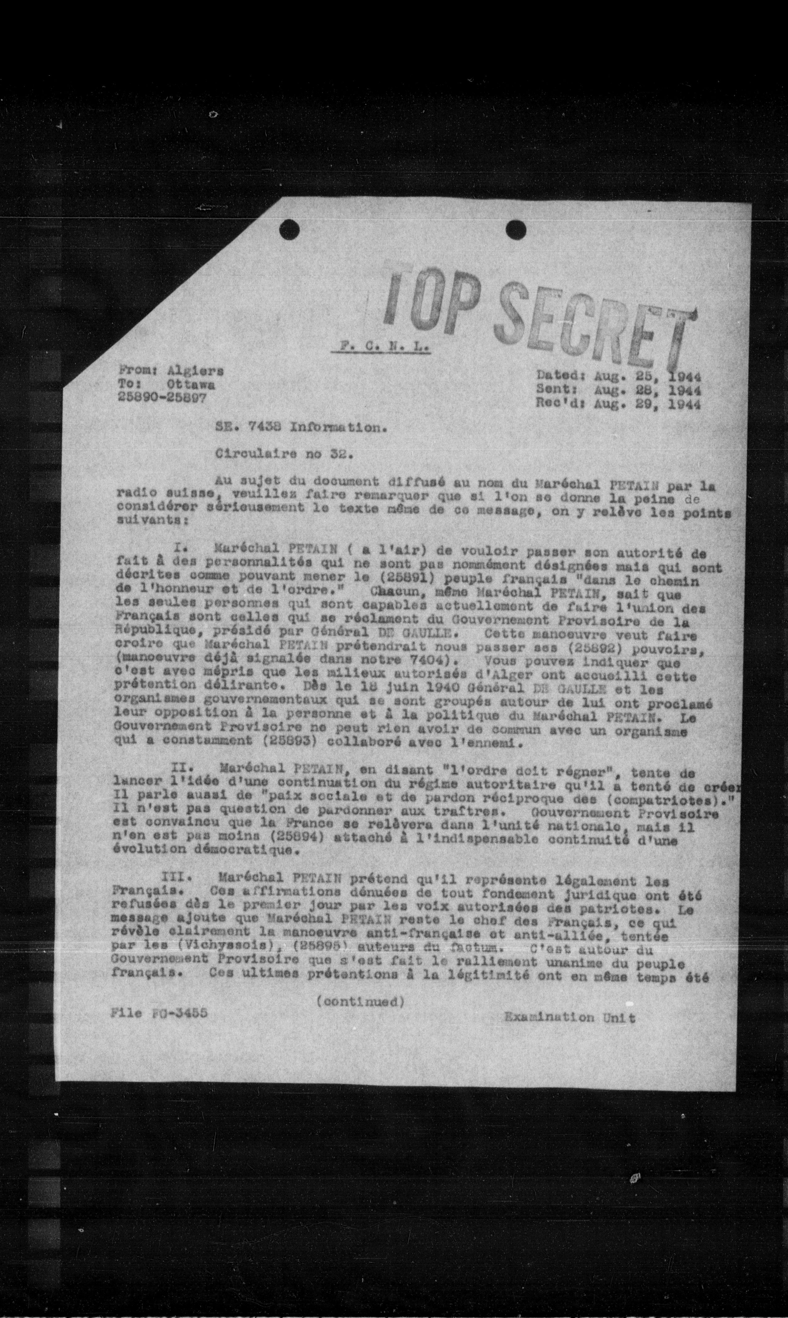 I. Maréchal PETAIN (à l'air) de vouloir passer son autorité de fait à des personnalités qui ne sont pas nommément désignées mais qui sont décrites comme pouvant mener le (25891) peuple français "dans le chemin de l'honneur et de l'ordre." Chacun, même Maréchal PETAIN, sait que les seules personnes qui sont capables actuellement de faire l'union des Français sont celles qui se réclament du Gouvernement provisoire de la République, présidé par Général DE GAULLE. Cette manœuvre veut faire croire que Maréchal PETAIN prétendrait nous passer ses (25892) pouvoirs, (manoeuvre déjà signalée dans notre 7404). Vous pouvez indiquer que c'est avec mépris que les milieux autorisés d'alger ont accueilli cette prétention délirante. Dès le 18 juin 1940 Général DE GAULLE et les organismes gouvernementaux qui se sont groupés autour de lui ont proclamé leur opposition à la personne et à la politique du Maréchal PETAIN. Le Gouvernement provisoire ne peut rien avoir de commun avec un organisme qui a constamment (25893) collaboré avec l'ennemi.