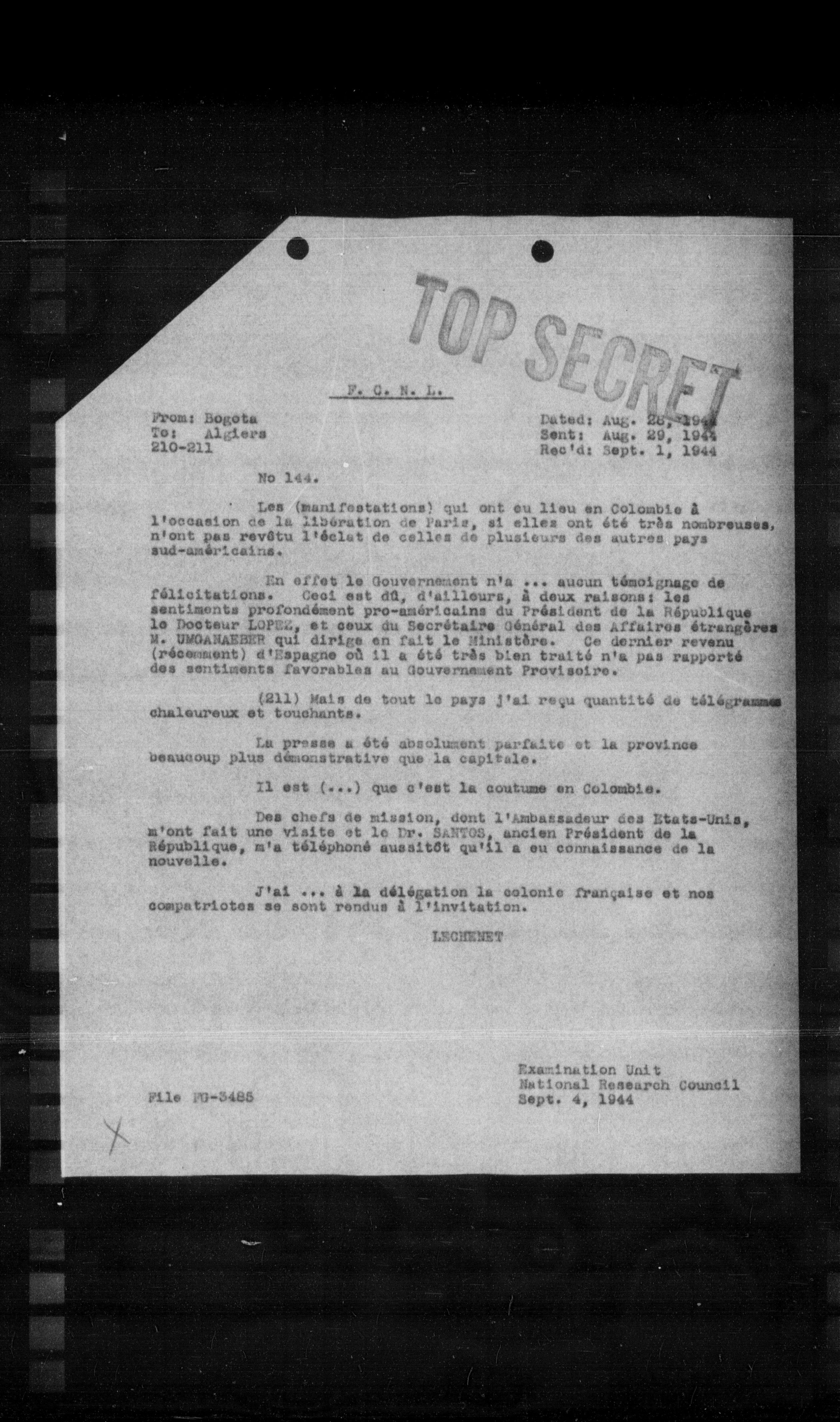 **From:** Bogota **To:** Algiers **Date:** Aug. 20, 1944 **Rec'd:** Sept. 1, 1944 **No 144.**