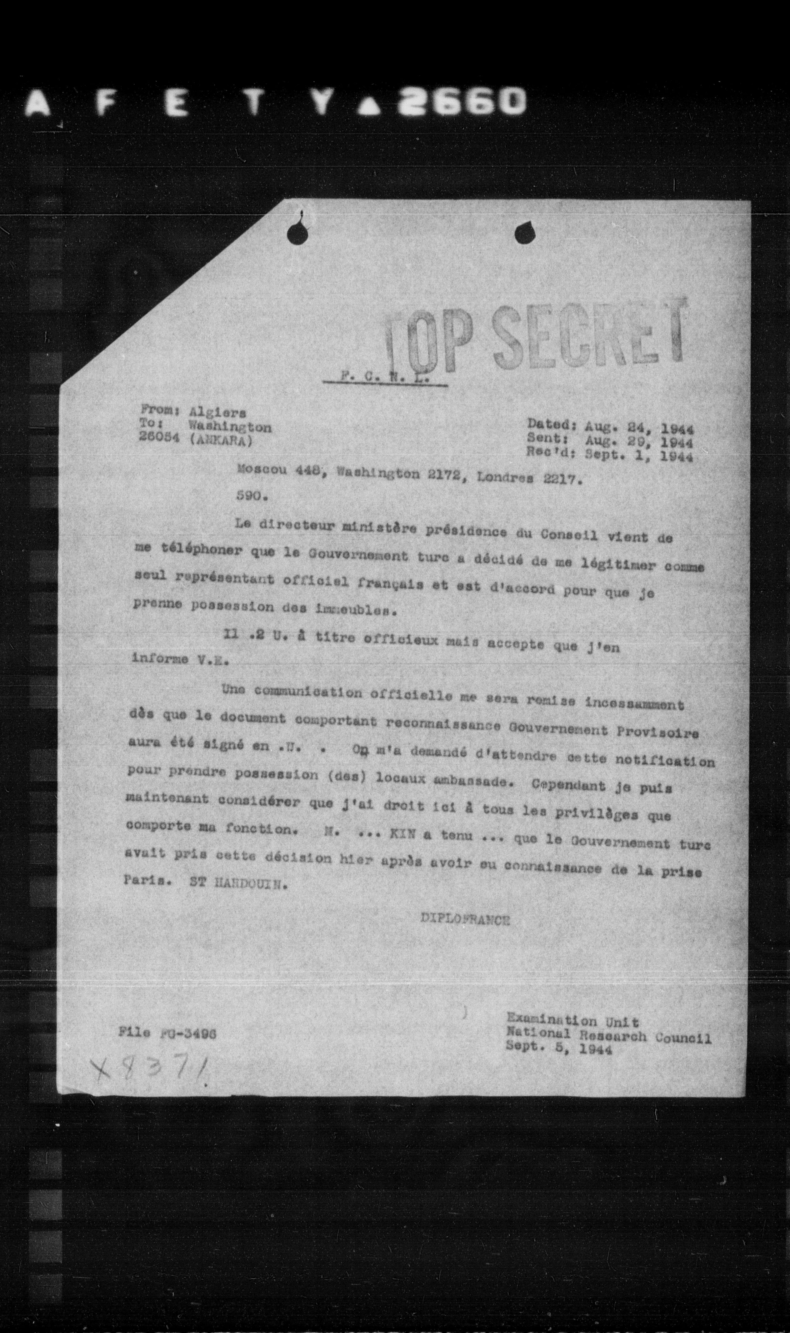 Une communication officielle me sera remise incessamment dês que le document comportant reconnaissance Gouvernement Provisoire aura été signé en .U. . On m'a demandé d'attendre cette notification pour prendre possession (des) locaux ambassade. Cependant je puis maintenant considérer que j'ai droit ici a tous les privilèges que comporte ma fonction. M. ... KIN a tenu ... que le Gouvernement ture avait pris cette décision hier après avoir eu connaissance de la prise Paris. ST HANDOUIN.