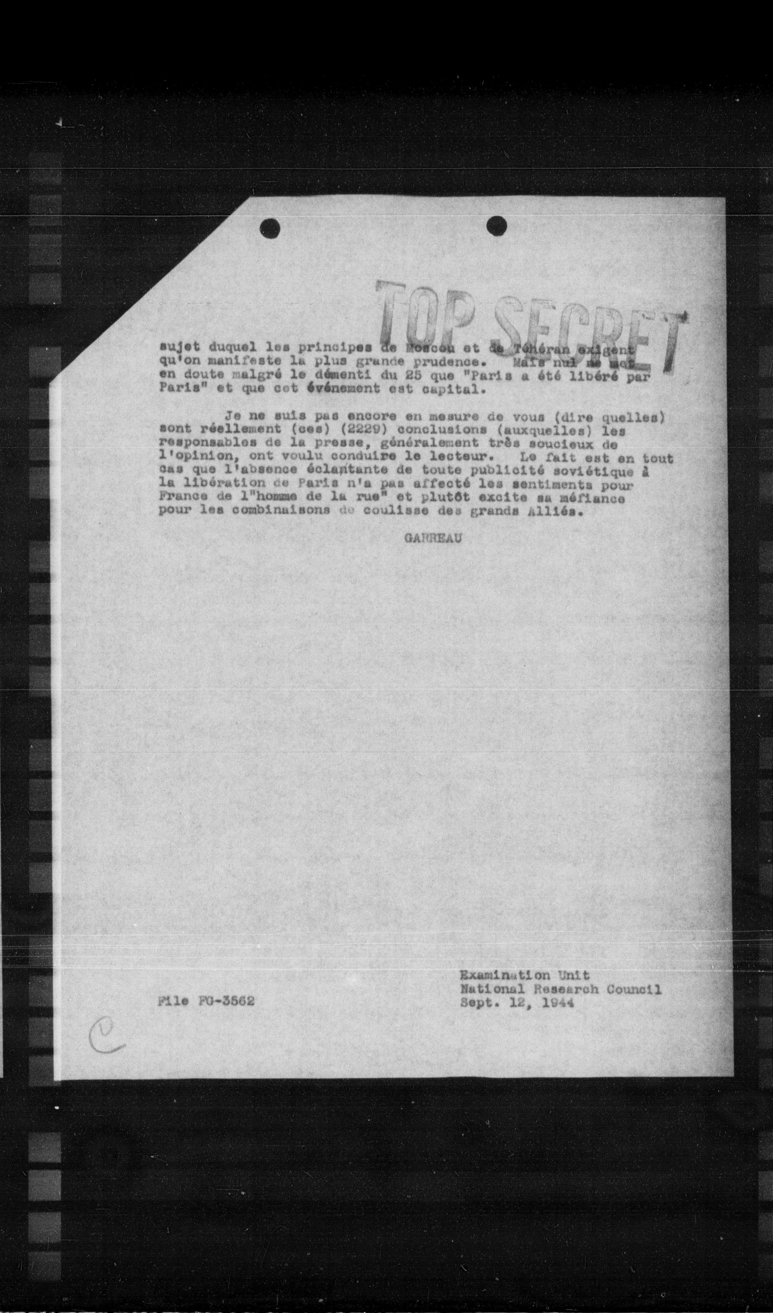 Je ne suis pas encore en mesure de vous (dire quelles) sont réellement (ces) (2229) conclusions (auxquelles) les responsables de la presse, généralement très soucieux de l'opinion, ont voulu conduire le lecteur. Le fait est en tout cas que l'absence échantante de toute publicité soviétique à la libération de Paris n'a pas affecté les sentiments pour France de l"humme de la rue" et plutôt excite sa méfiance pour les combinaisons de coulisse des grands alliés.