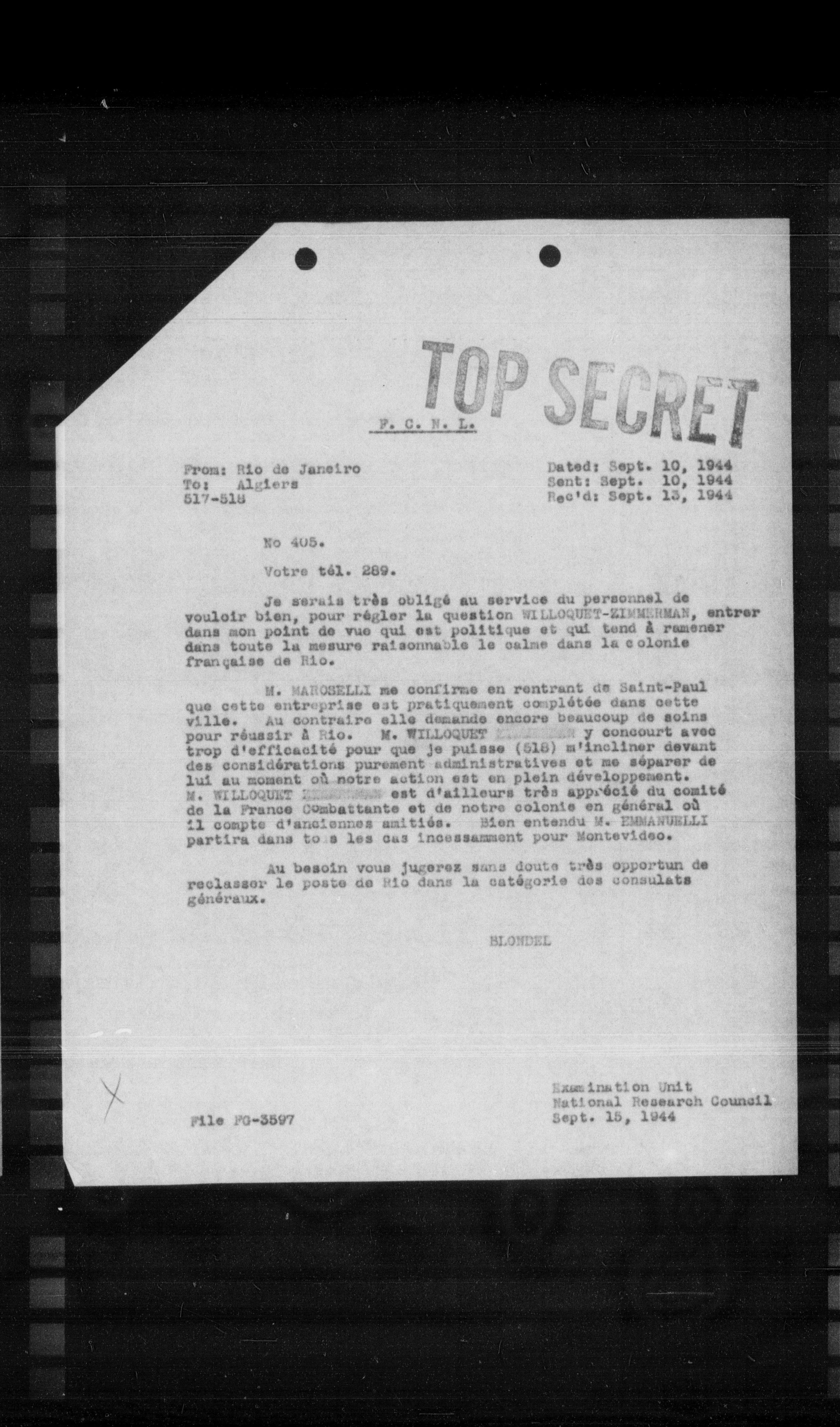 M. MARGHELLI me confirme en rentrant de Saint-Paul que cette entreprise est pratiquement complétée dans cette ville. Au contraire elle demande encore beaucoup de soins pour réussir à Rio. M. WILLOQUET EINBERMAN y concourt avec trop d'efficacité pour que je puisse (618) m'incliner devant des considérations purement administratives et me séparer de lui au moment où notre action est en plein développement. M. WILLOQUET EINBERMAN est d'ailleurs très apprécié du comité de la France Combattante et de notre colonie en général où il compte d'anciennes amitiés. Bien entendu M. EMMANDELLI partira dans tous les cas incessamment pour Montevideo.
