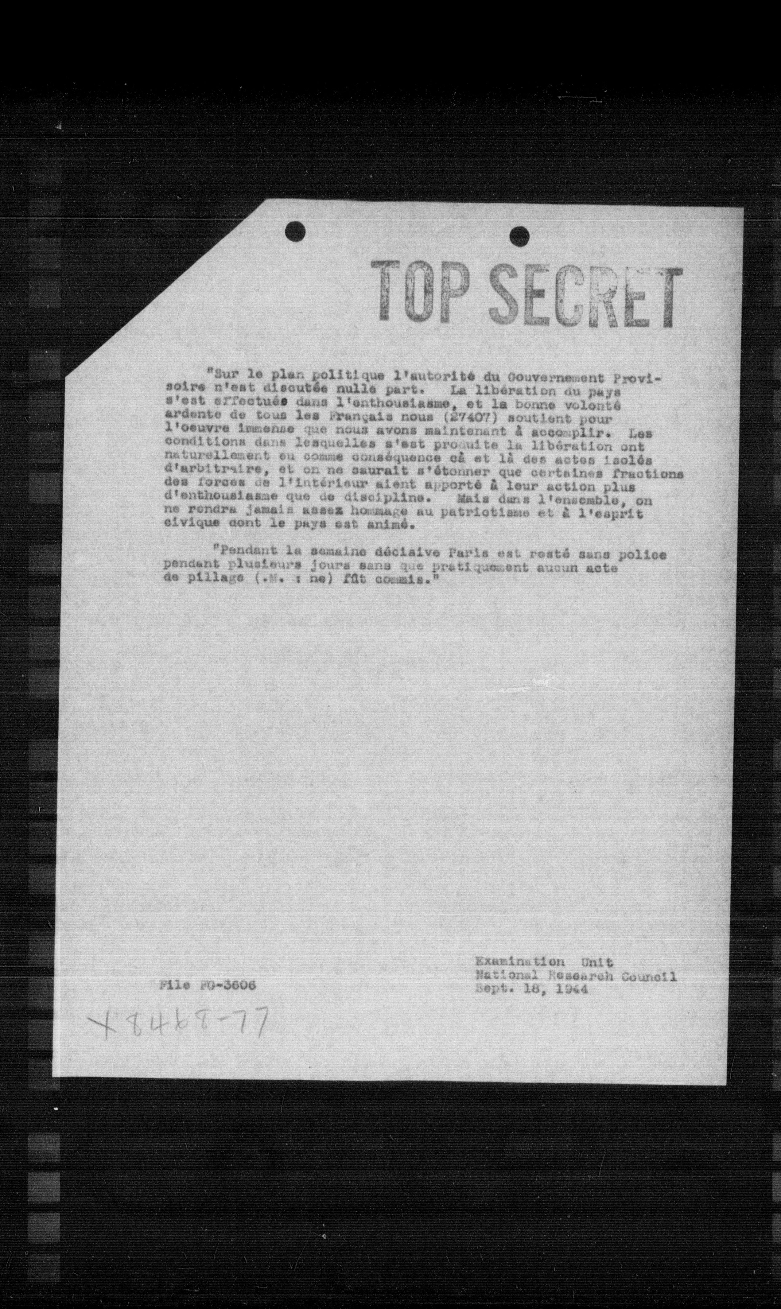 "Sur le plan politique l'autorité du Gouvernement Provisoire n'est discutée nulle part. La libération du pays s'est effectuée dans l'enthousiasme, et la bonne volonté ardente de tous les Français nous (27407) soutient pour l'oeuvre immense que nous avons maintenant a accomplir. Les conditions dans lesquelles s'est proguite la libération ont naturellement su comme conséquence of et la des actes isolés d'arbitraire, et on ne saurait s'étonner que certaines fractions des forces de l'intérieur alent apporté a leur action plus d'enthousiasme que de discipline. Mais dans l'ensemble, on ne rendra jamais assez homme au patriotisme et a l'esprit civique dont le pays est animé.