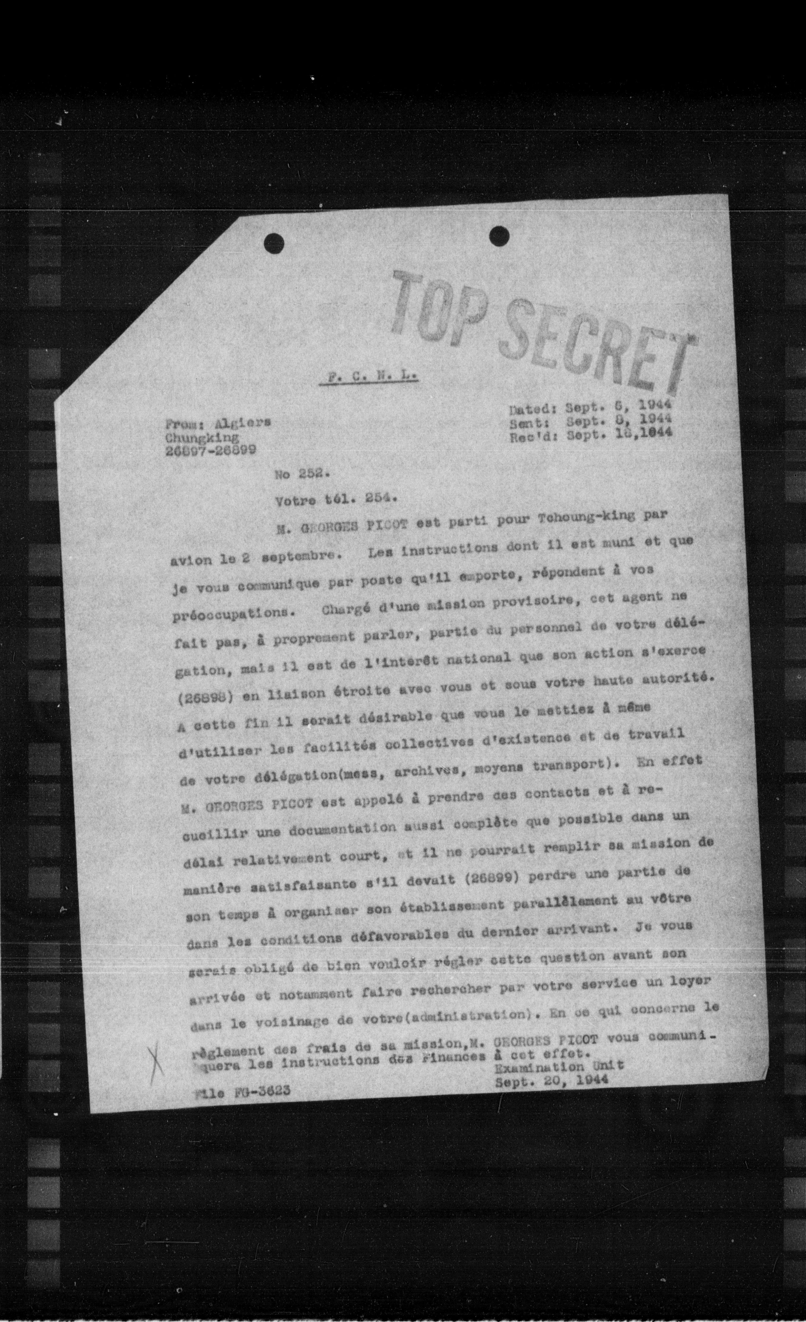 **M. GEORGES PICOT est parti pour Tehoung-king par avion le 2 septembre. Les instructions dont il est muni et que je vous communique par poste qu'il importe, répondent à vos préoccupations. Chargé d'une mission provisoire, cet agent ne fait pas, à proprement parler, partie du personnel de votre délégation, mais il est de l'intérêt national que son action s'exerce (26898) en liaison étroite avec vous et sous votre haute autorité. À cette fin il serait désirable que vous le mettiez à même d'utiliser les facilités collectives d'existence et de travail de votre délégation (mess, archives, moyens transport). En effet, M. GEORGES PICOT est appelé à prendre des contacts et à recueillir une documentation aussi complète que possible dans un délai relativement court, et il ne pourrait remplir sa mission de manière satisfaisante s'il devait (26899) perdre une partie de son temps à organiser son établissement parallèlement au vôtre dans les conditions défavorables du dernier arrivant. Je vous serais obligé de bien vouloir régler cette question avant son arrivée et notamment faire rechercher par votre service un loyer dans le voisinage de votre (administration). En ce qui concerne le règlement des frais de sa mission, M. GEORGES PICOT vous communia quera les instructions des Finances à cet effet.**