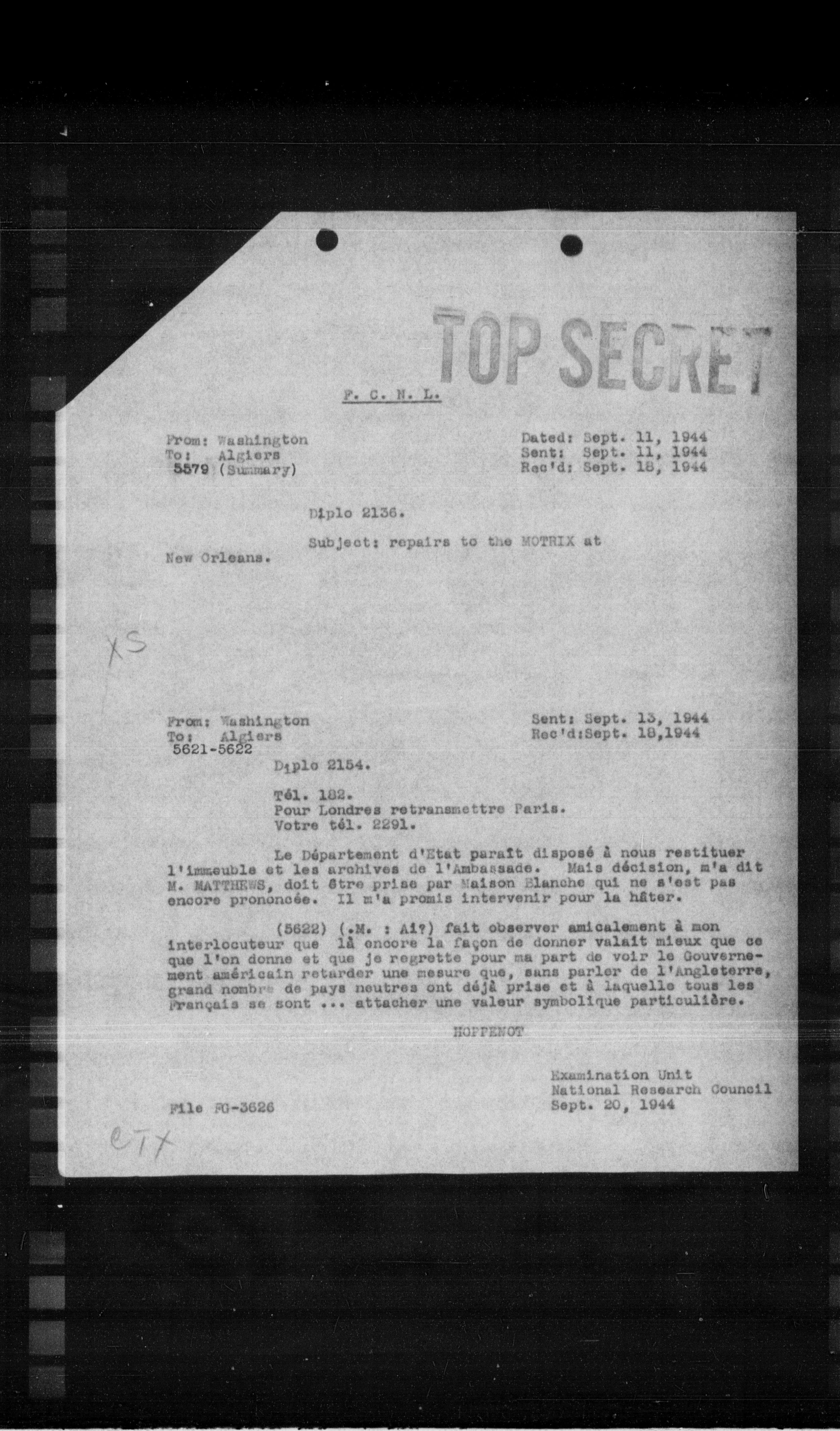 Le Département d'Etat paraît disposé à nous restituer l'immeuble et les archives de l'ambassade. Mais décision, m'a dit N. MATTHEWS, doit être prise par Maison Blanche qui ne s'est pas encore prononcée. Il m'a promis intervenir pour la hâter.