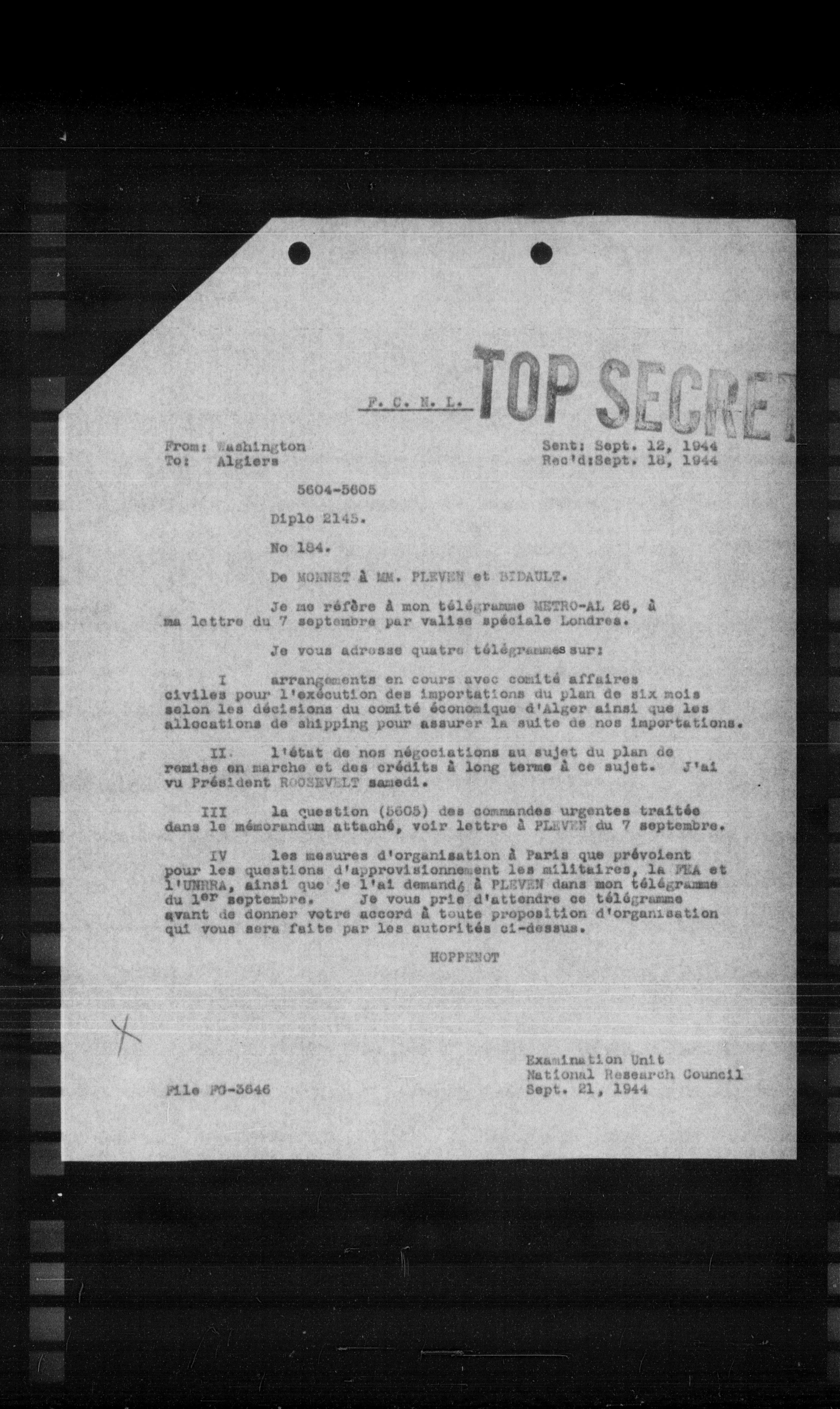 Je me réfère à mon télégramme METRO-AL 26, à ma lettre du 7 septembre par valise spéciale Londres.