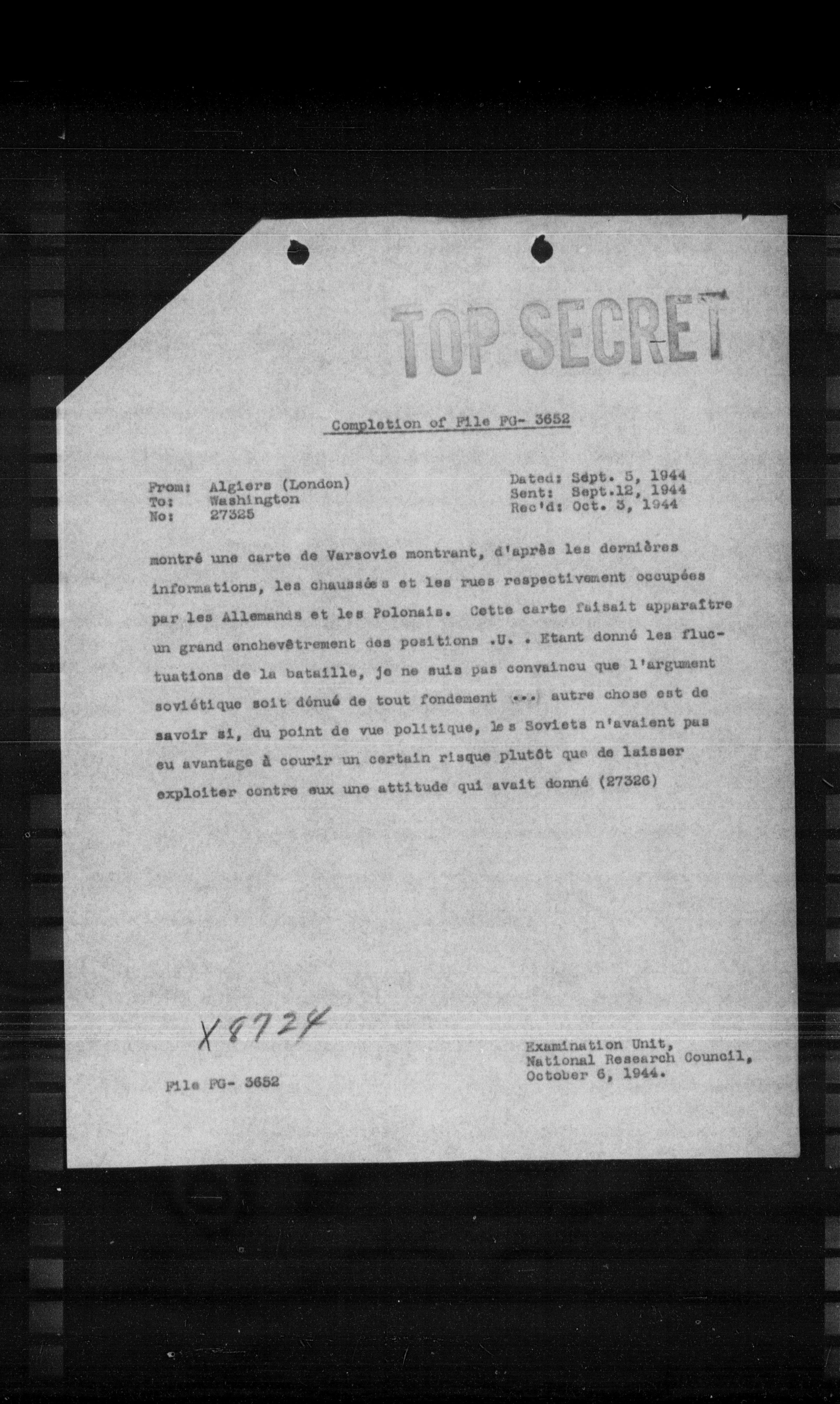 montre une carte de Varsovie montrant, d'apres les dermières informations, les chaussées et les rues respectivement occupées par les Allemands et les Polonais. Cette carte faisait apparaitre un grand enchevêtrement des positions .U. . Etant donné les fluctuations de la bataille, je ne suis pas convaincu que l'argument soviétique soit dénué de tout fondement ... autre chose est de savoir si, du point de vue politique, les Soviets n'avaient pas eu avantage a courir un certain risque plutôt que de laisser exploiter contre eux une attitude qui avait donné (27326)
