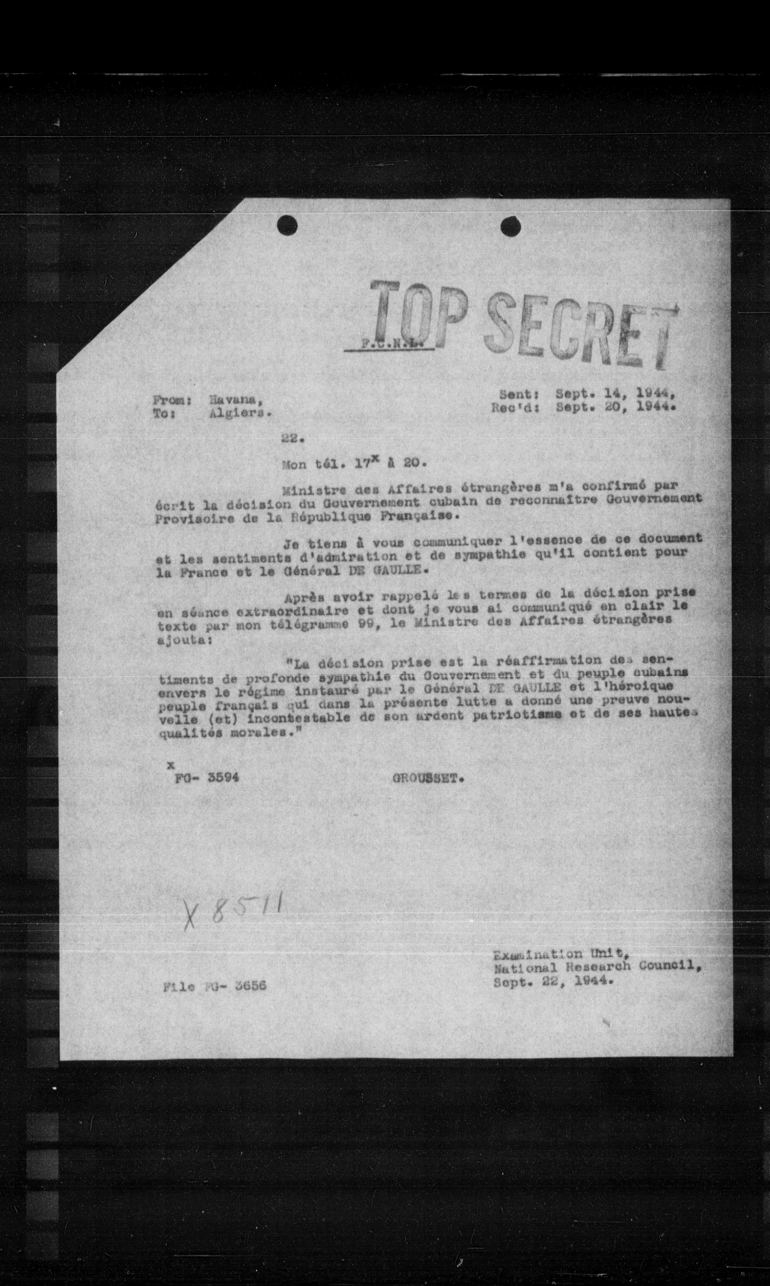 "La décision prise est la réaffirmation des sentiments de profonde sympathie du Gouvernement et du peuple cubains envers le régime instauré par le Général DE GAULLE et l'héroïque peuple français qui dans la présente lutte a donné une preuve nouvelle (et) incontestable de son ardent patriotisme et de ses hautes qualités morales."