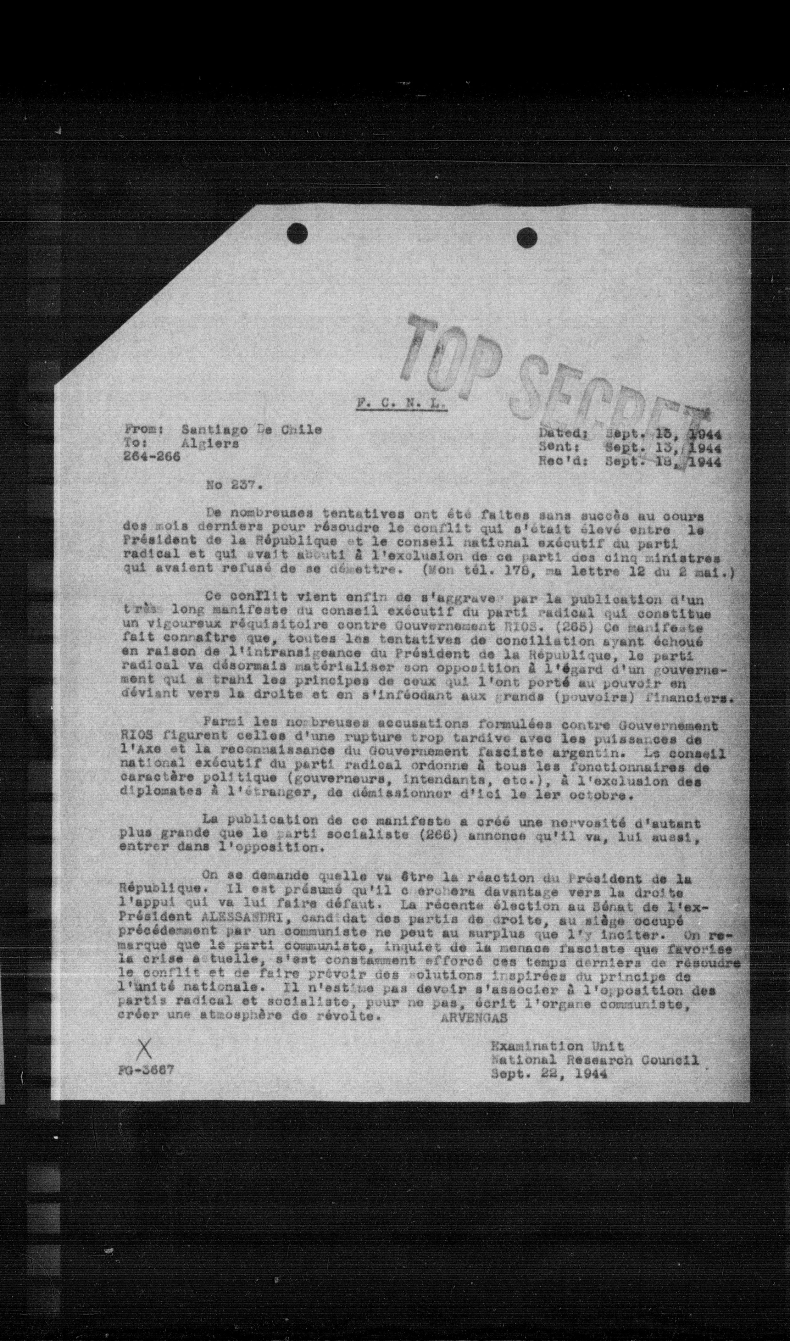 Ce conflit vient enfin de s'aggraver par la publication d'un très long manifeste du conseil exécutif du parti radical qui constitue un vigoureux réquisitoire contre Gouvernement RIOS. (265) Ce manifeste fait connaître que, toutes les tentatives de conciliation ayant échoué en raison de l'intransigeance du Président de la République, le parti radical va désormais matérialiser son opposition à l'égard d'un gouvernement qui a trahi les principes de ceux qui l'ont porté au pouvoir en déviant vers la droite et en s'inféodant aux grands (pouvoirs) financiers.